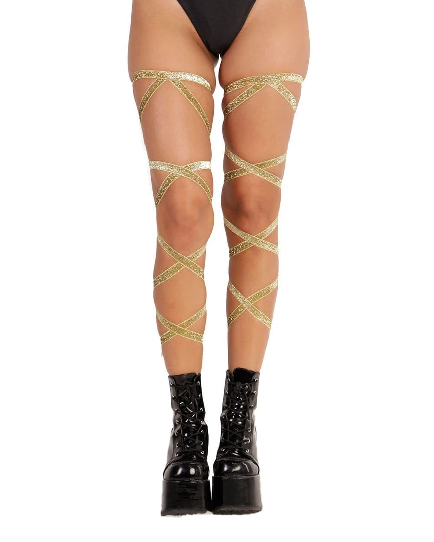 Our new non-slip Gold Glitter Leg Wraps are lined with a silicone lining inside to hug your thighs and stay up all night while you’re dancing away. These leg wraps are now sold in pairs! These leg wraps will add more texture, color, and character to your legs whether you are wearing fishnets, nylons, or fluffies.