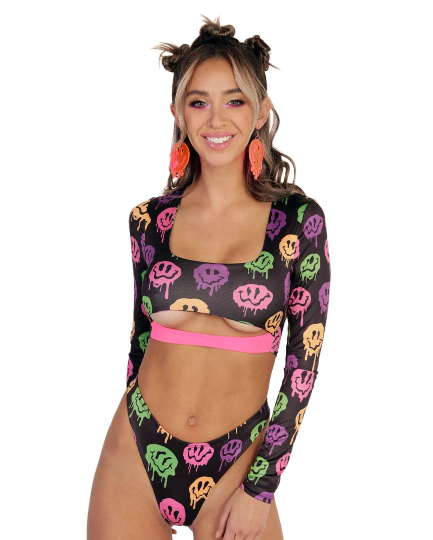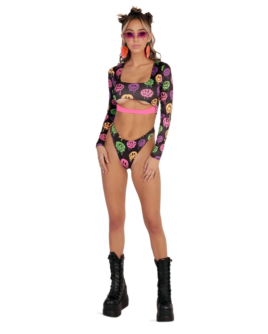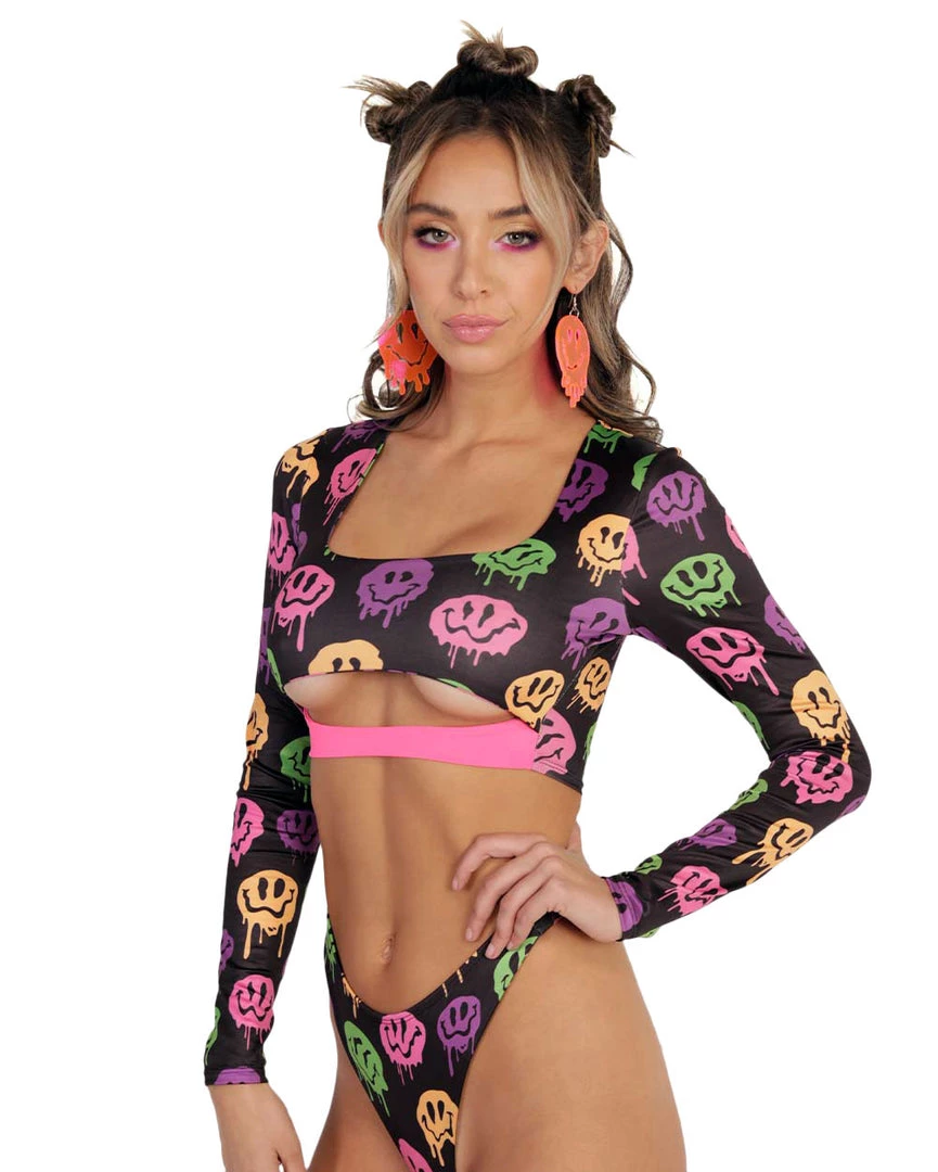 Wear the Neon Euphoria Long Sleeve Crop Top because u know what they say: always put on a happy (acid) face! This top has a cropped cut, a body-hugging silhouette, and a print that’s sure to melt ur mind.