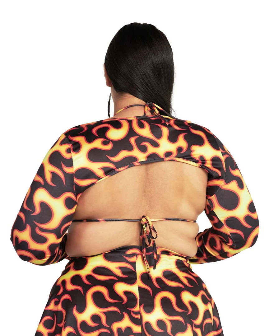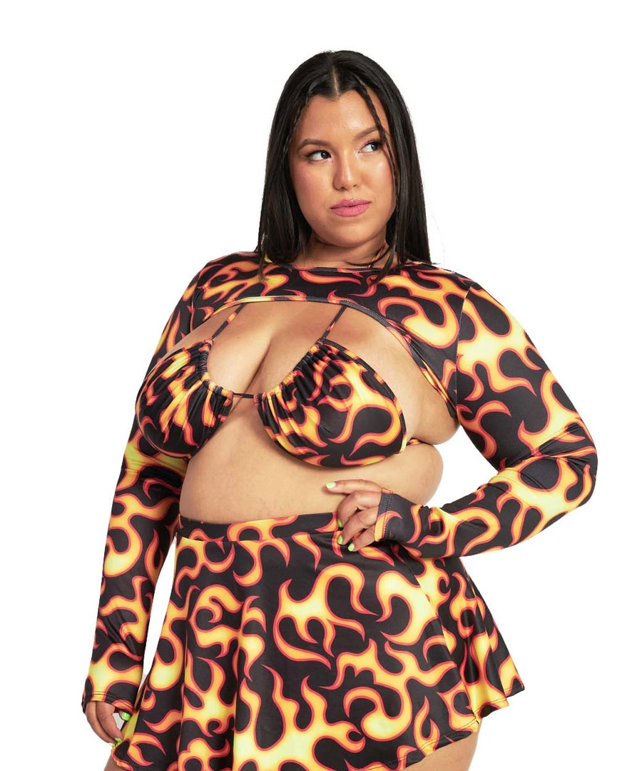 Keep the fire burning with our Hot Stuff Ultra Crop Top. You’ll amp up the energy on the dancefloor when u wear this long sleeve top with its matching top and skater skirt that have a fiery hot flame print on them.
