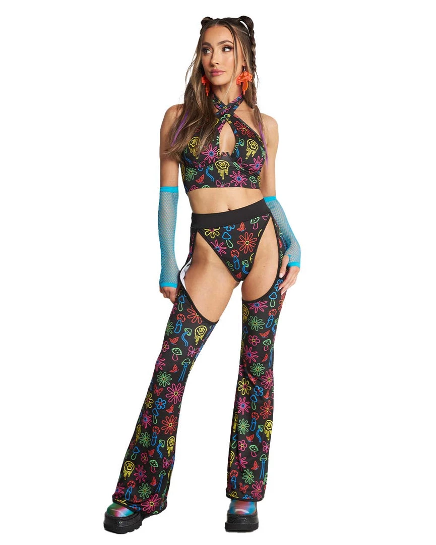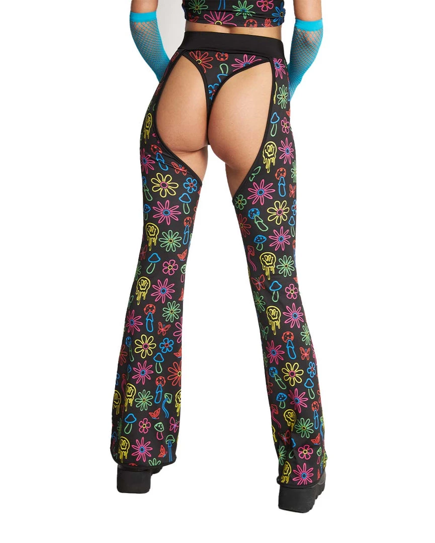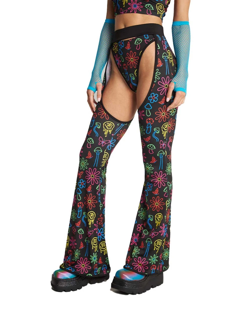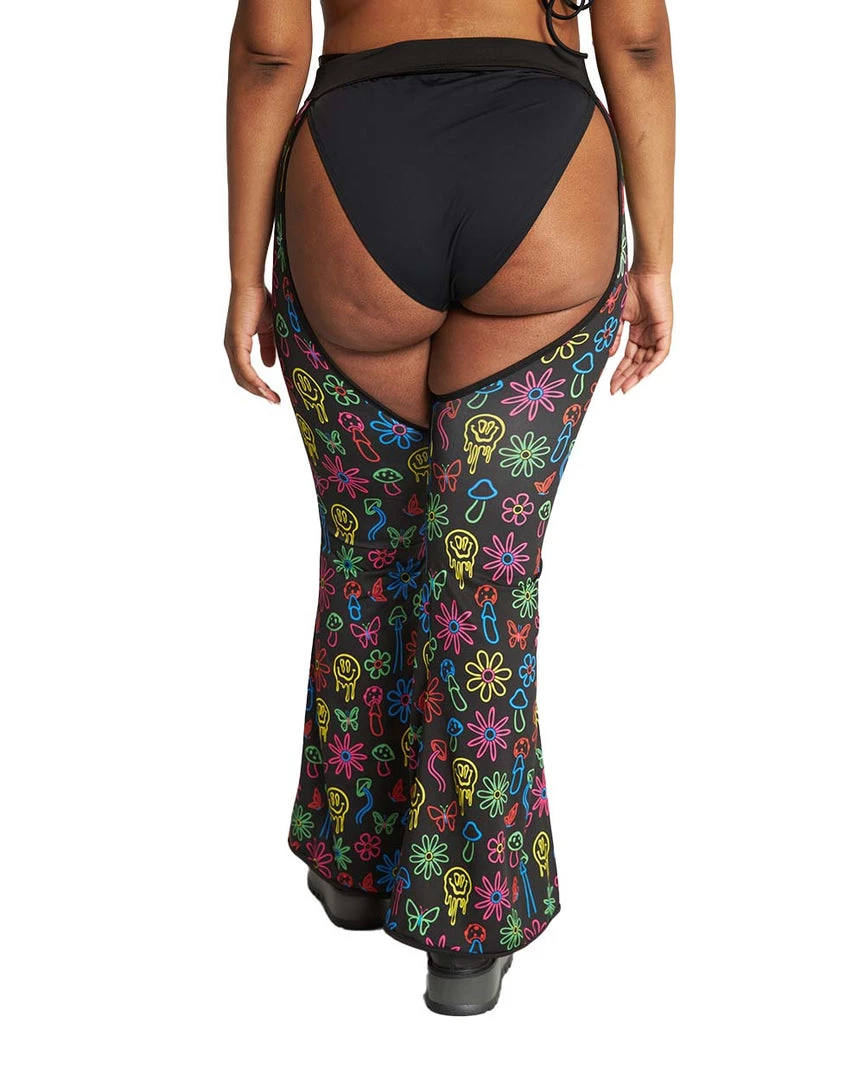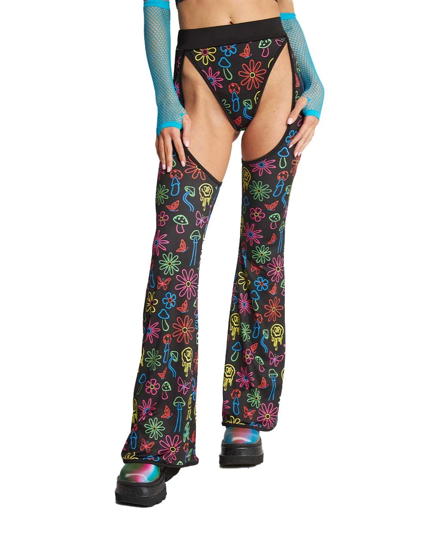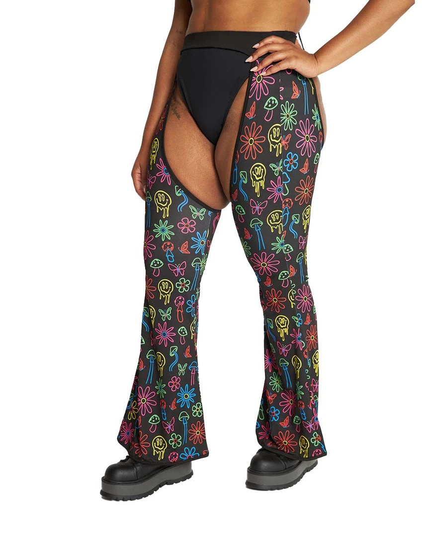Expand the mind in our Dazed & Confused Rainbow Mushroom Chaps. These bottoms have a high-waist cut, the perfect amount of stretch, and a psychedelic mushroom print that’s sure to send u on the trippiest trip of ur life.