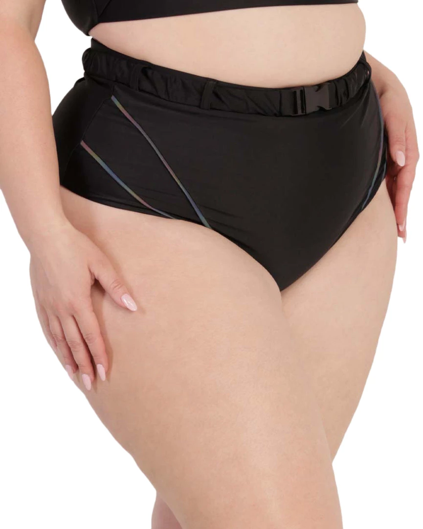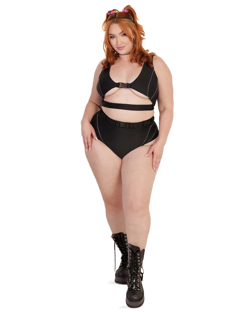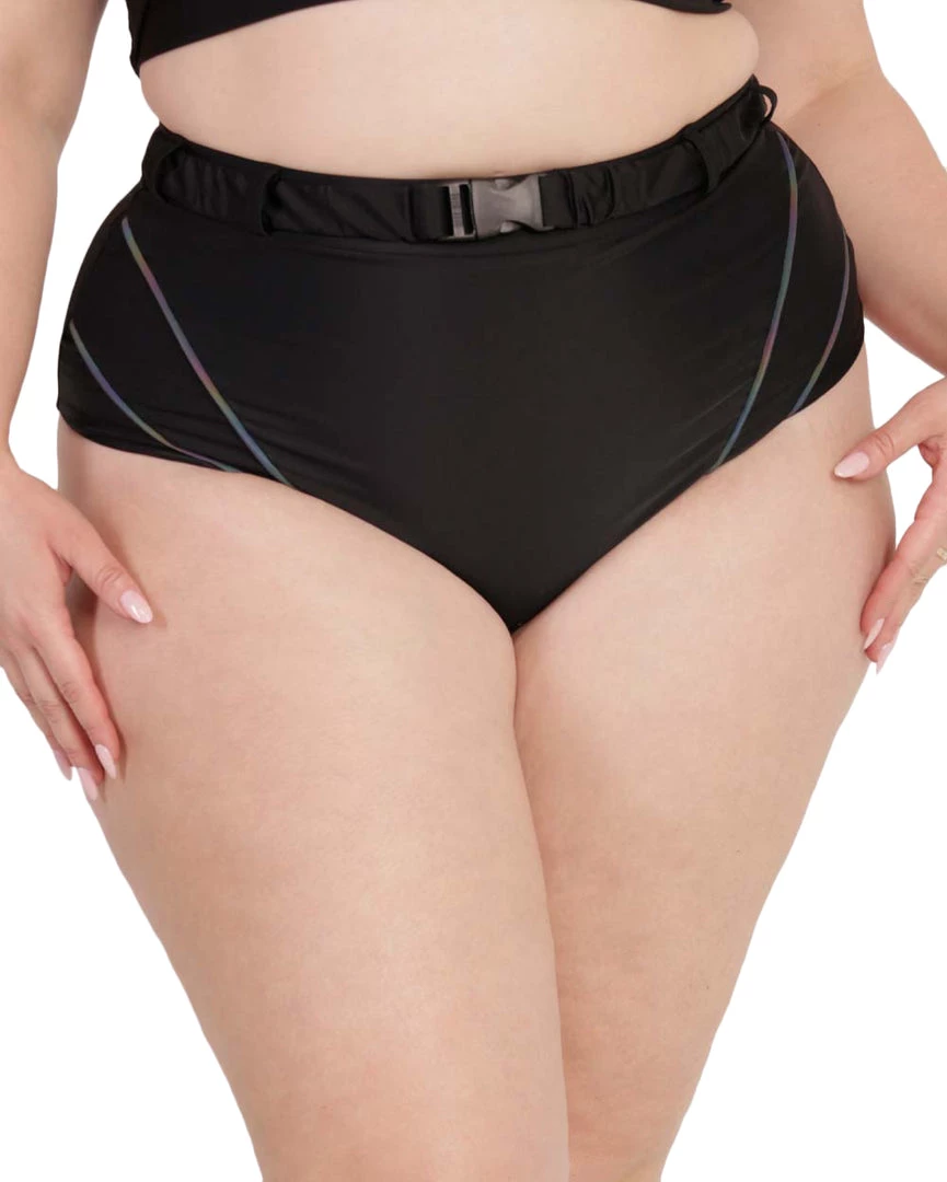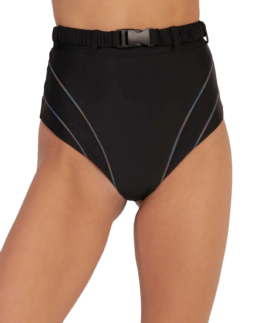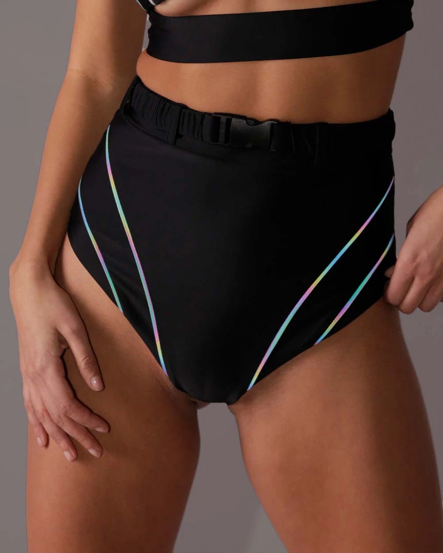 Subtle, edgy, and sexy is what the Turn Up the Lights High-Waist Speed Clasp Rainbow Reflective Bottoms are all about. They have speed clasp closure on the waistband, extra cheeky coverage, and holographic lines across the bottoms.Â