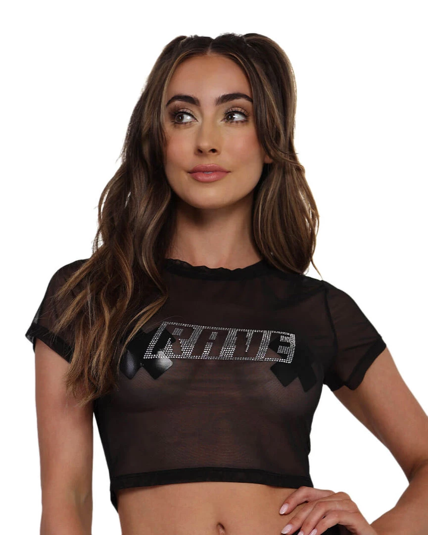 Show off ur favorite bralettes or festival pasties with the Rave, Rave, Repeat Rhinestone Mesh Crop Top. This black top is made from see-through material and features a sparkly text that reads “Rave.”