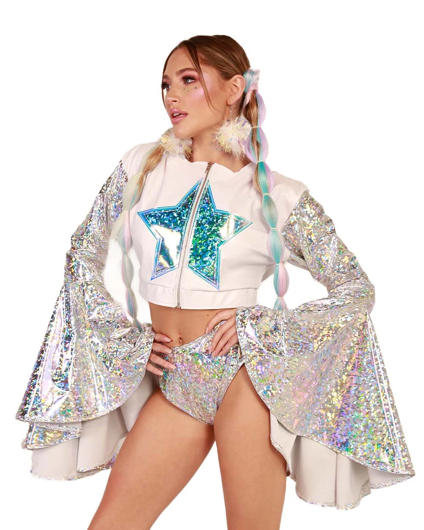 Ready to go full sparkly for ur next rave? Our J. Valentine Shooting Star Jacket is the way to go. This cropped jacket has a zip-up closure, a glittery star print, and bell sleeves that are made from holographic material.