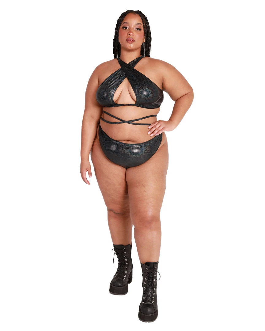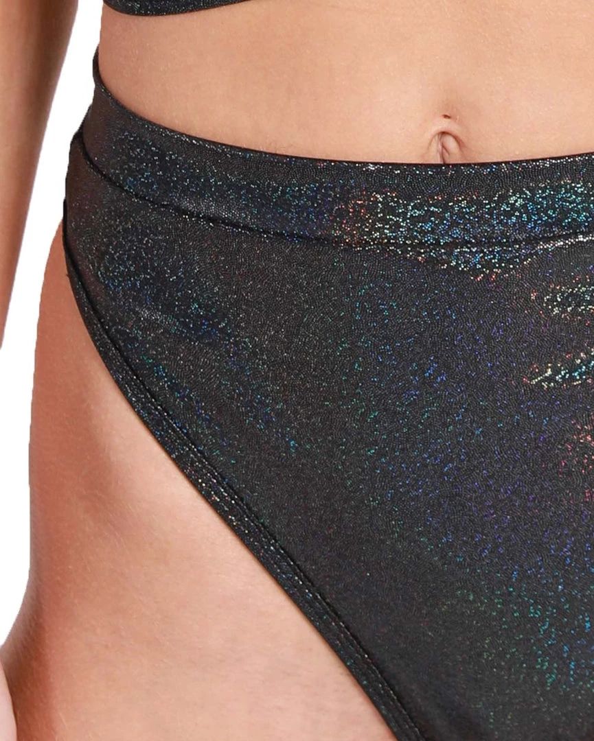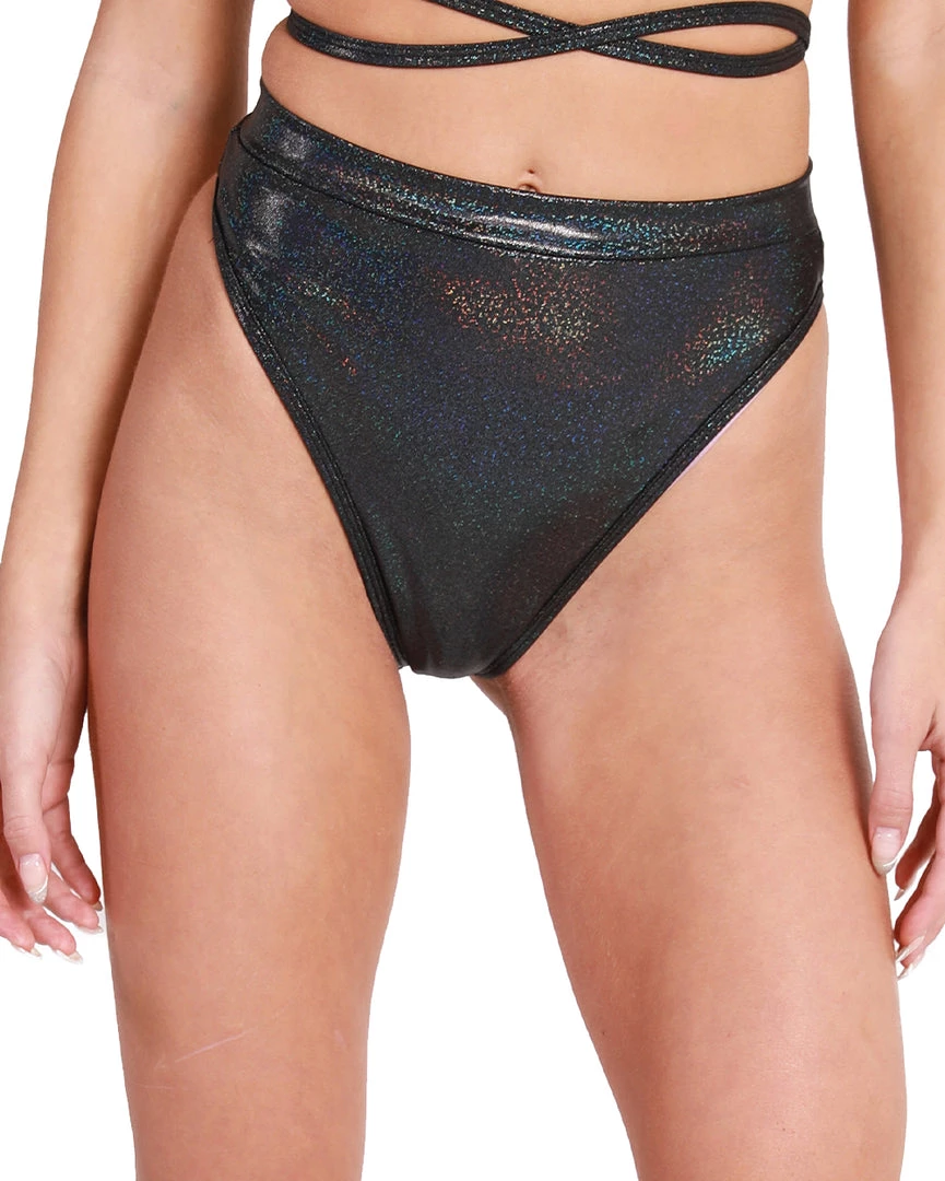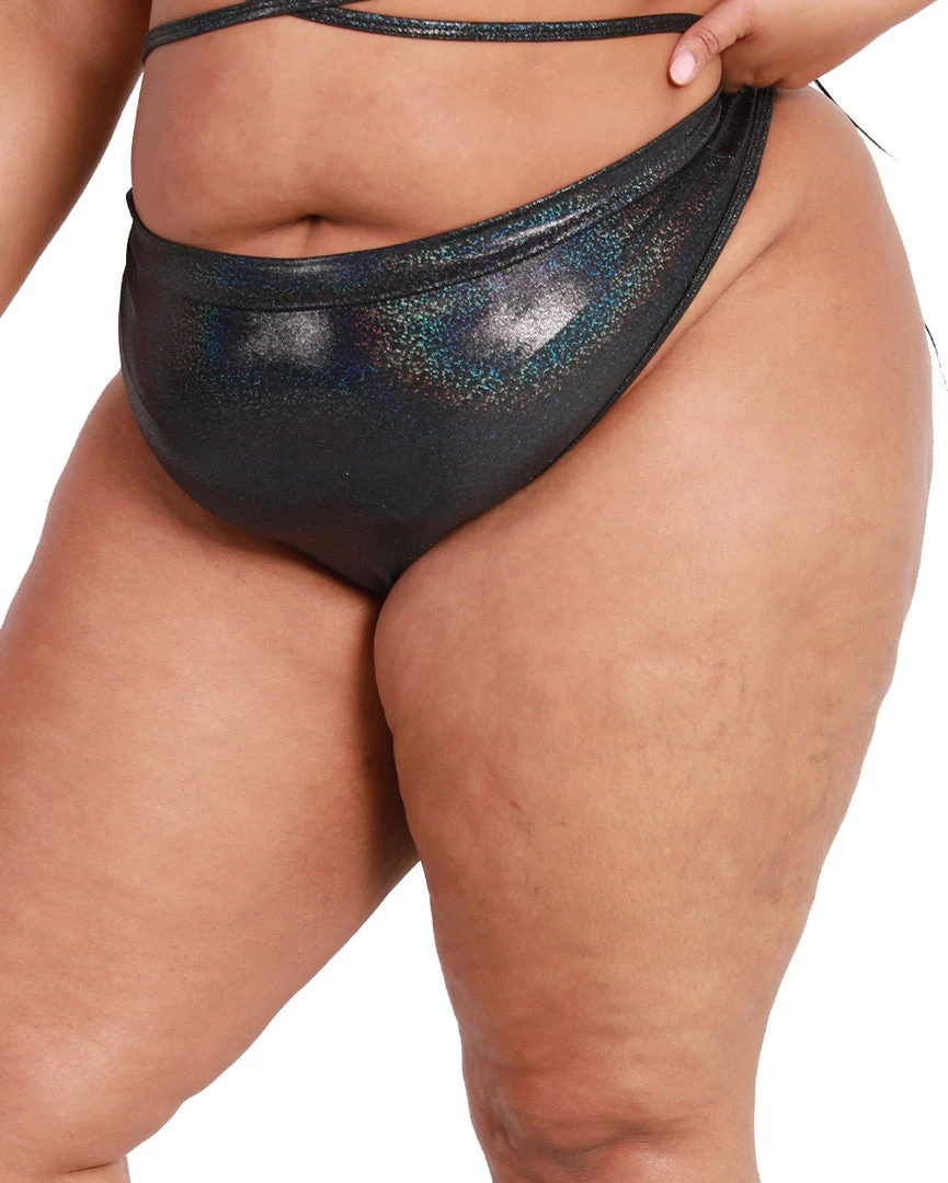 A conversation starter is what u are with our Rolita Couture Bootylicious Bottoms. Crafted with stretchy material, these bottoms feature a high-waist cut, cheeky coverage, and a glossy finish with rainbow speckles.