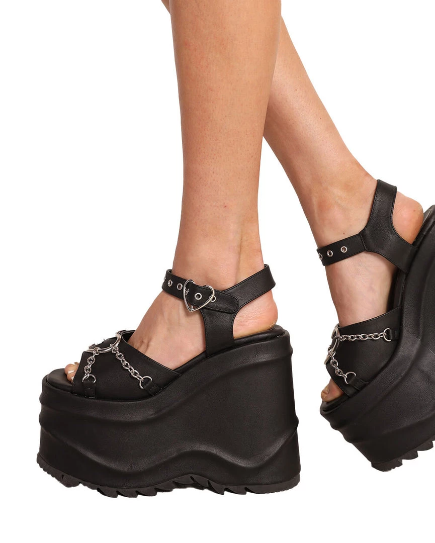 Stomp around in these Demonia Cross My Heart Platform Sandals. These slip-on style sandals have platform soles, silver chain accents, and a metal heart in the middle.