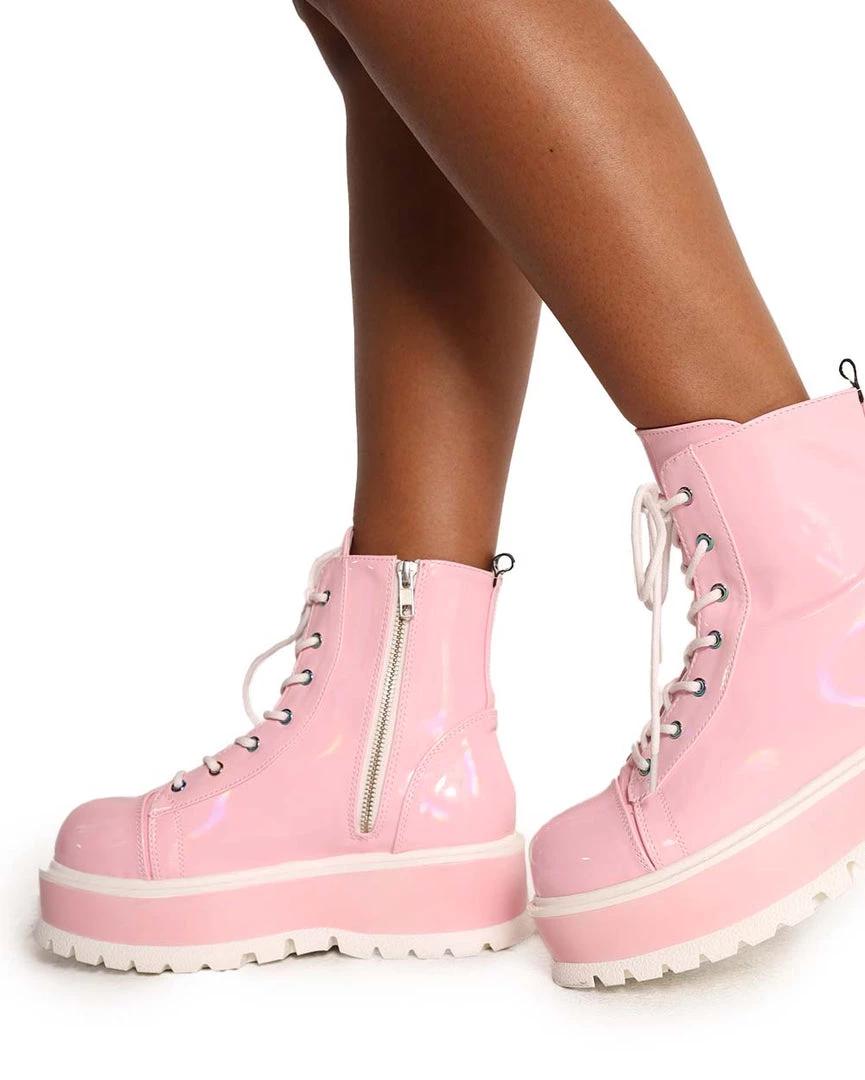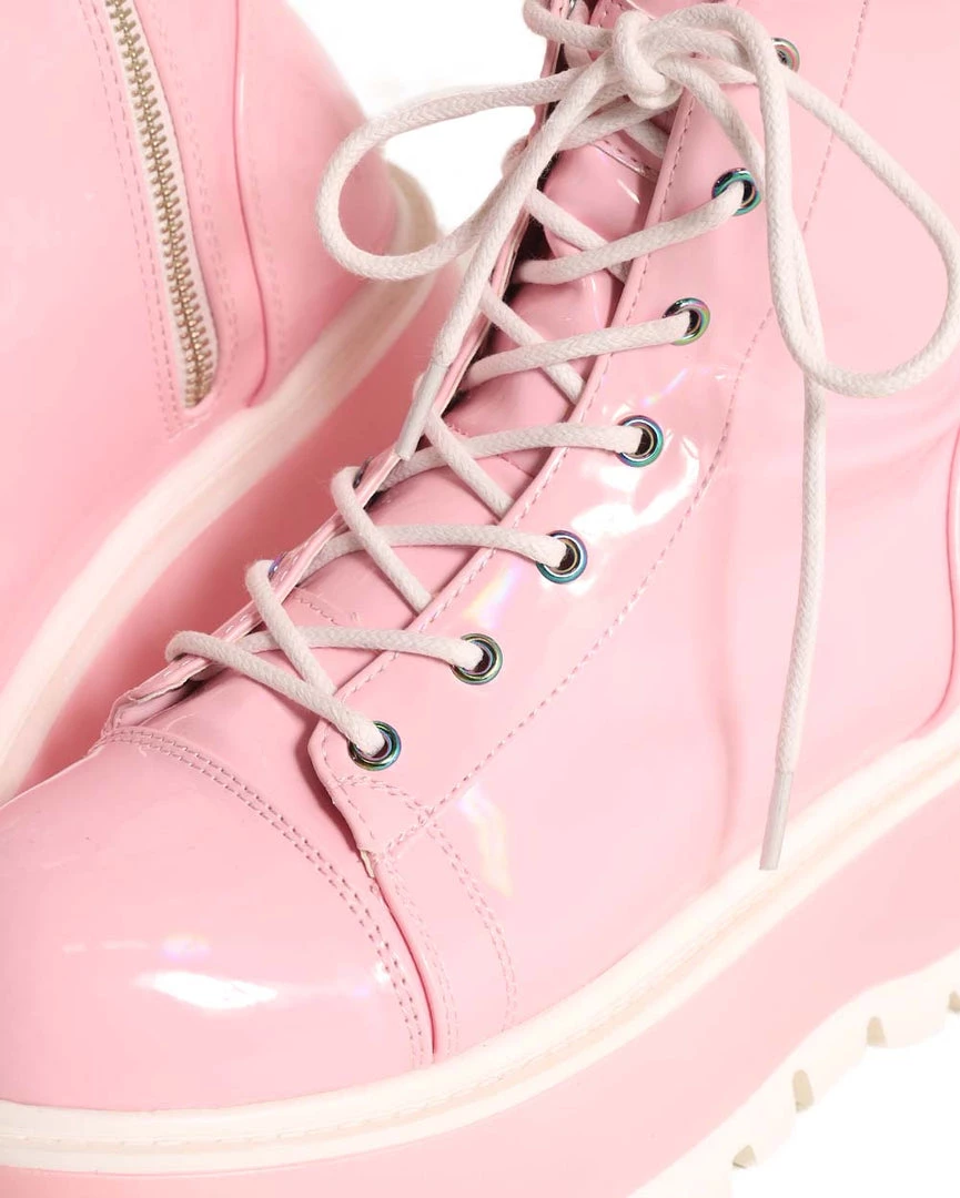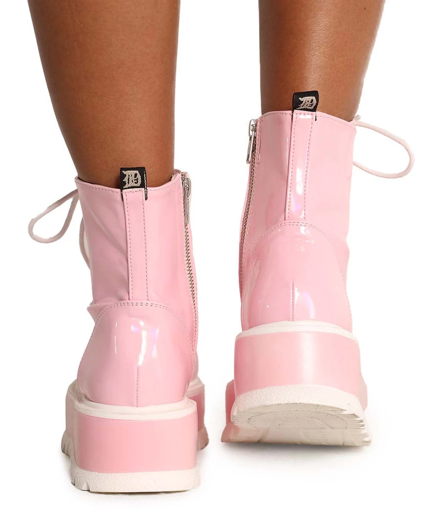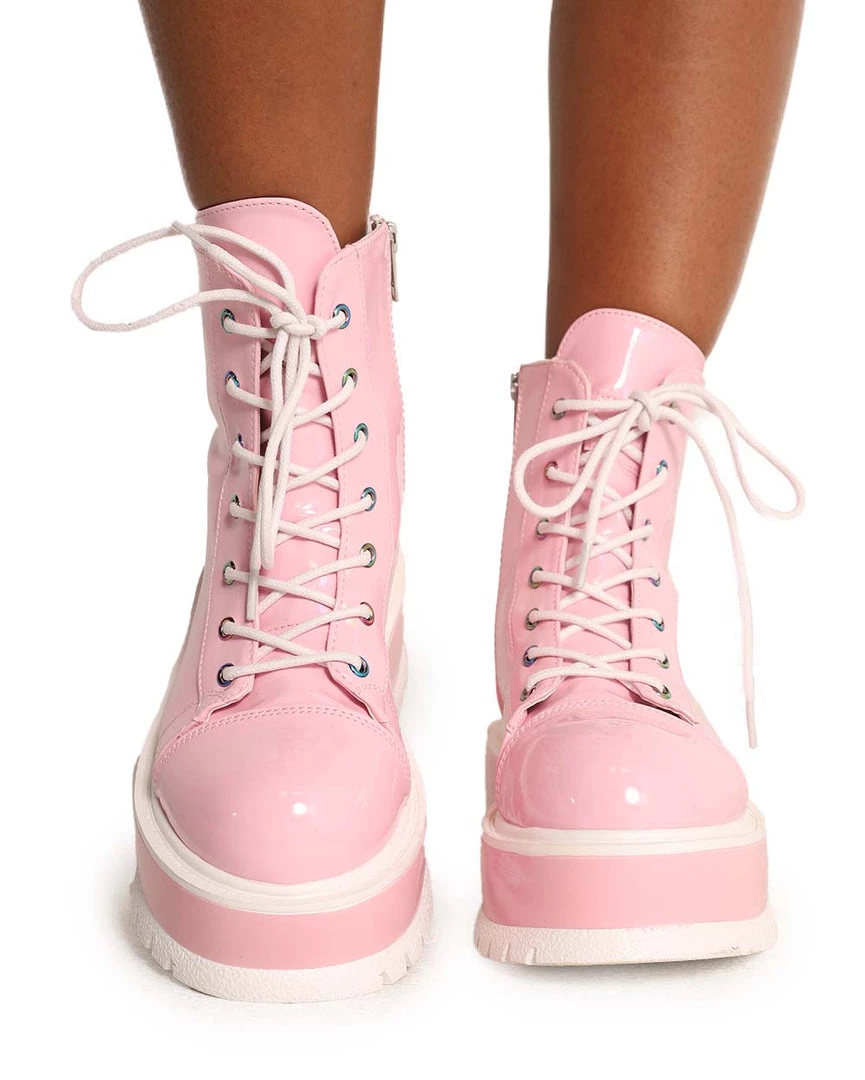 Wear our Demonia Life in Pink Holo Lace-Up Platform Boots ’cause you’re pretty in pink. These boots have a baby pink vinyl construction, chunky platform heels, and lace-up closure.