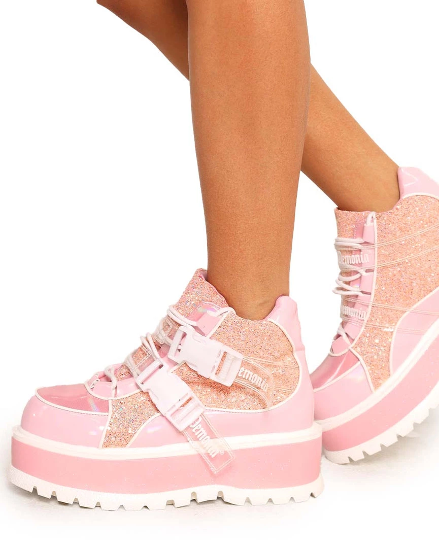 Step out with a cute trend-setting style with our Demonia Twinkle Toes Holo Platform Boots. These platform boots have a glossy pink and white construction and gold sparkles all over.