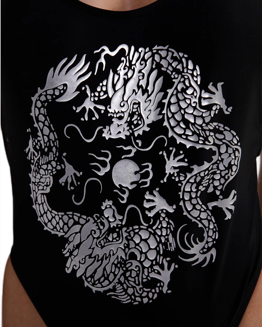 U are sizzling hot in our Blazin’ Silver Dragon Bodysuit. This one-piece features a body-hugging fit, a scoop neckline, and a silver dragon print that’s about to tame everyone who sees it.