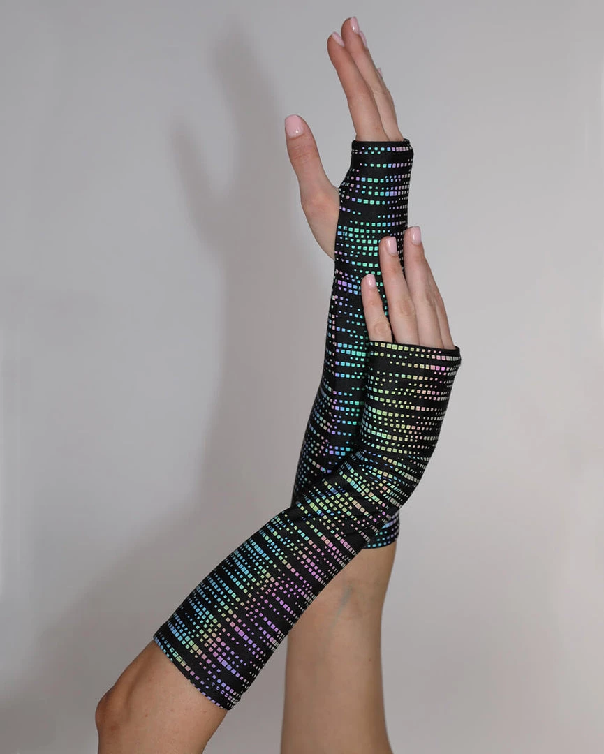Get ready to go to funky town with our Rainbow Glow Reflective Arm Warmers. Featuring a print that resembles abstract neon lights, these fingerless gloves illuminate whenever lights hit them.