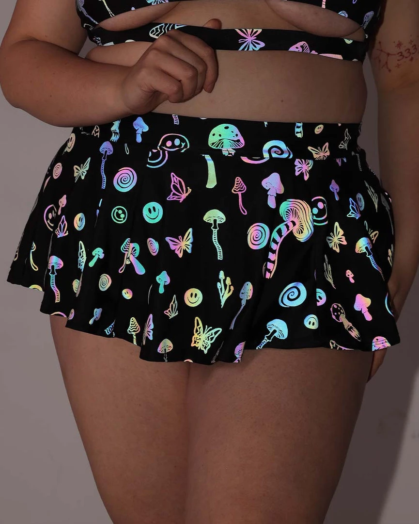 Teleport to a euphoric realm in our Wild Dimension Rainbow Reflective Skater Skirt. It features a stretchy waistband and tiny pleats for optimum twirl, and a trippy mushroom print that radiates under festival lights.