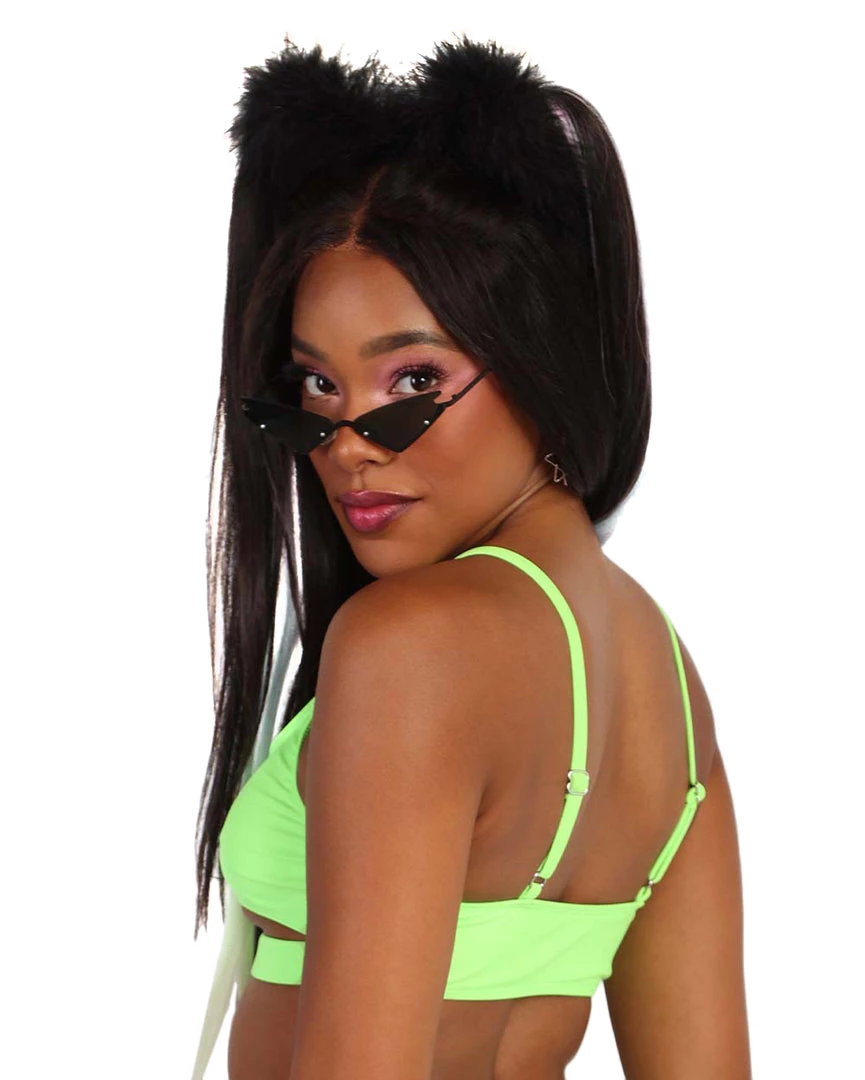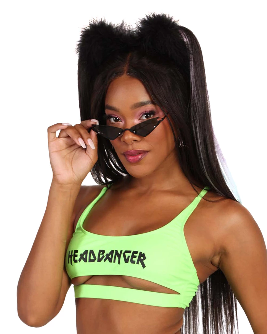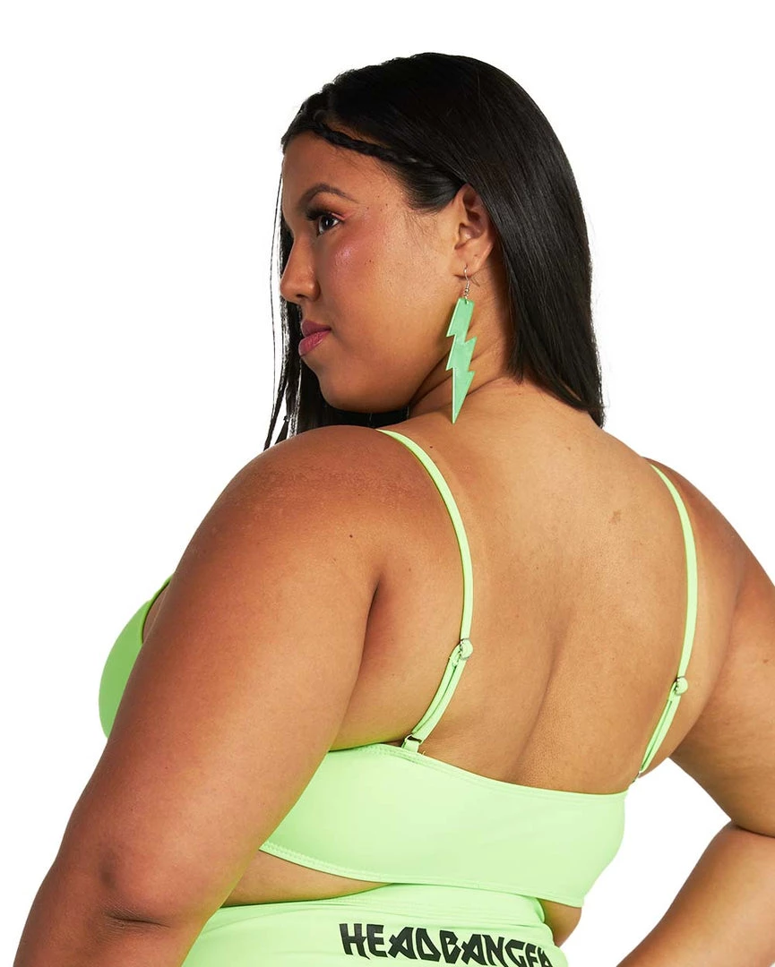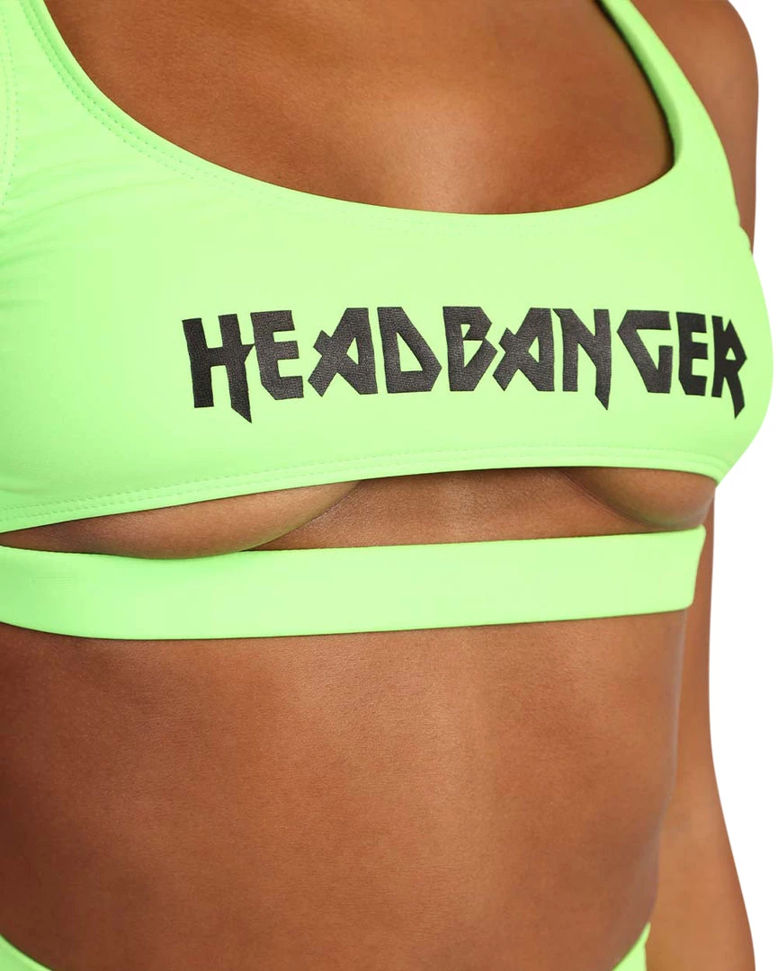 Get lost under the festival lights with our Recycled Fabric Headbanger Cut-Out Top. This traffic-stopping neon green bralette has a square neckline and a print that says HEADBANGER because u mean business riding those rails.
