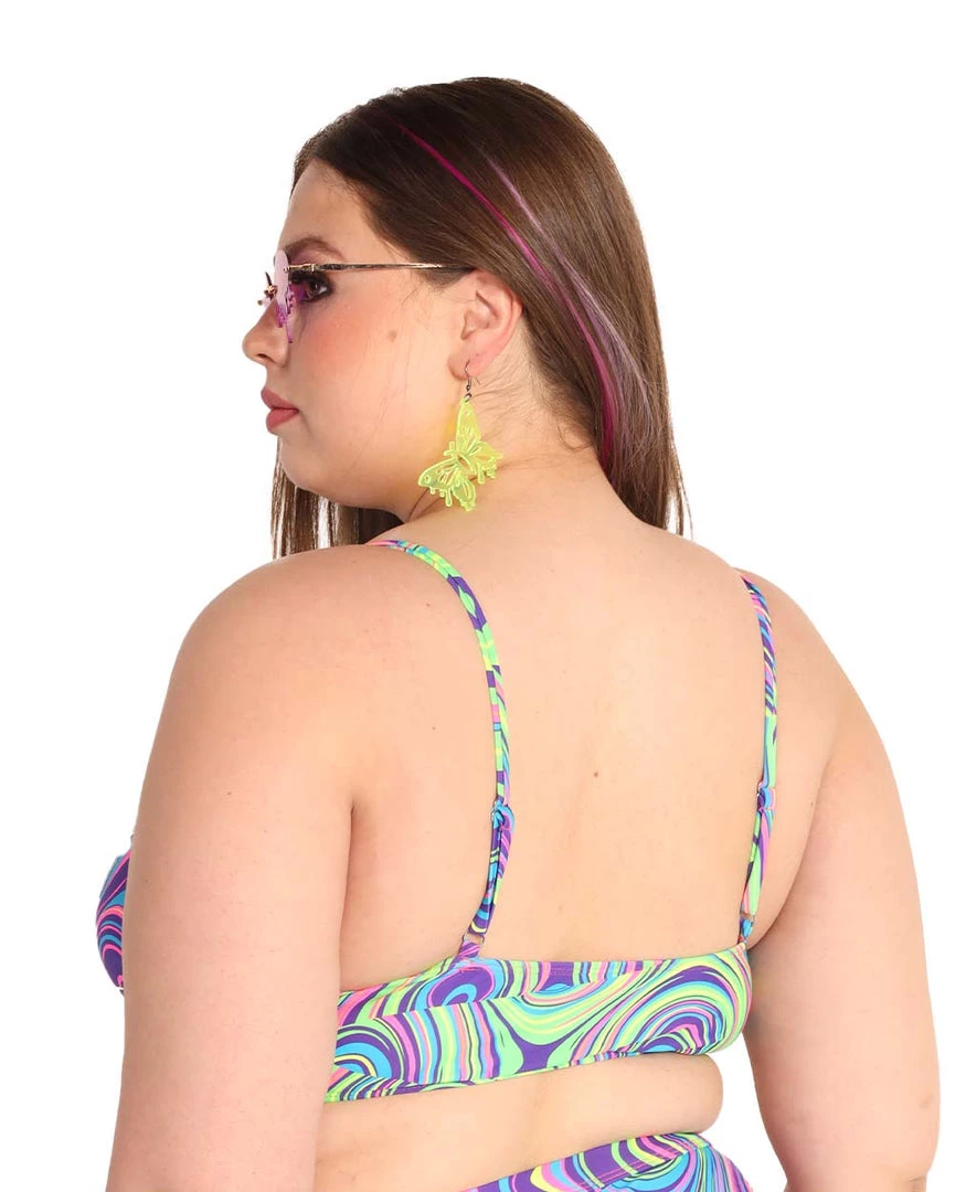 Get down and groovy in our Sooo Trippy Underboob Cutout Top. It features a square neckline, underboob cutout, and a vibrant, multicolored wavy print that illuminates under the festival lights.
