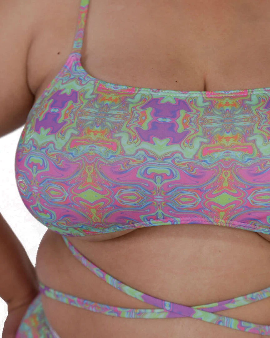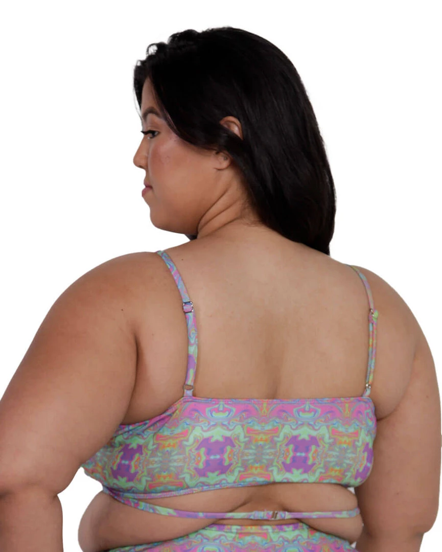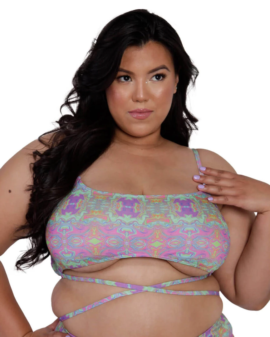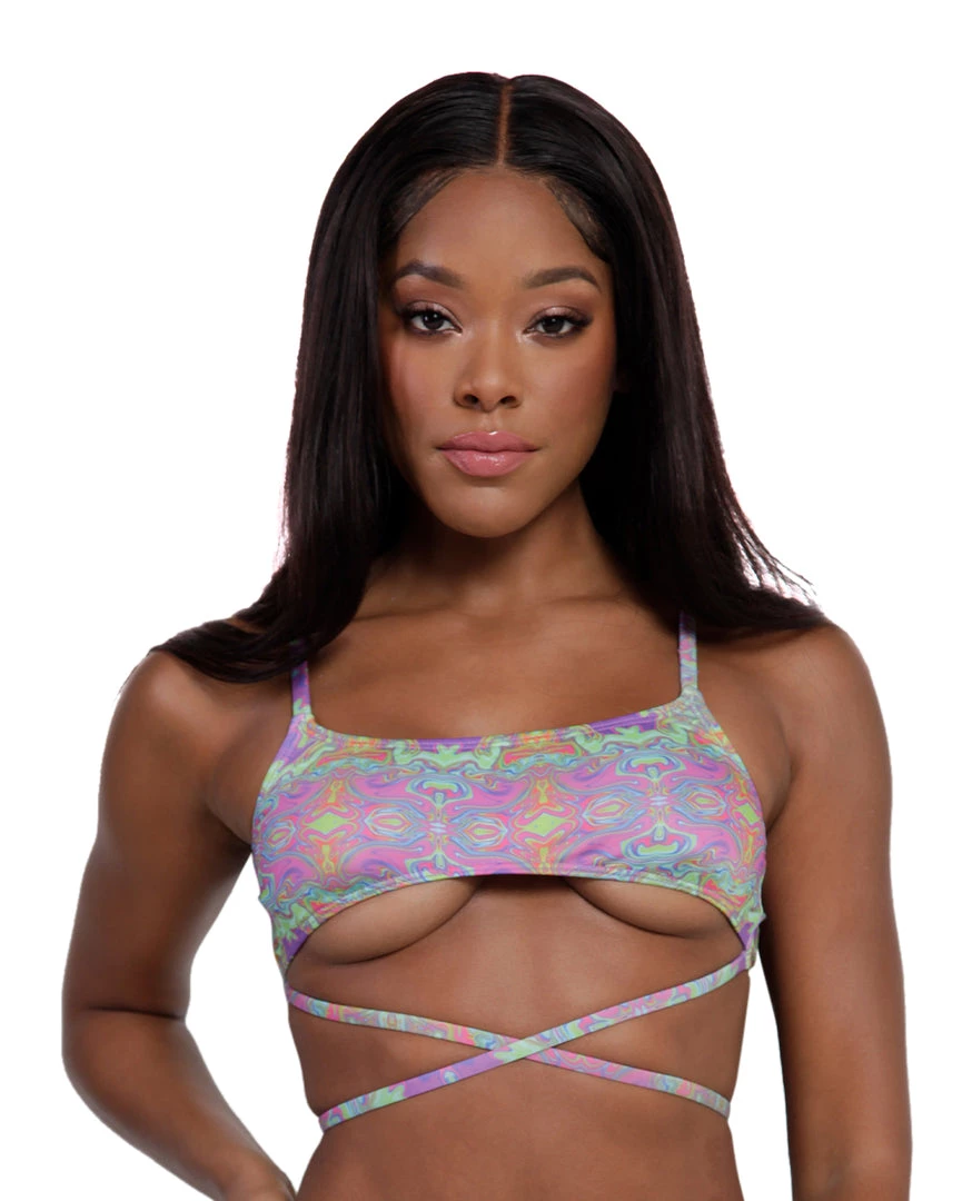Hit the road with our Take a Trip Wrap Around Crop Top. This trippy multicolored top features adjustable shoulder straps and an underboob cut with criss cross straps beneath.