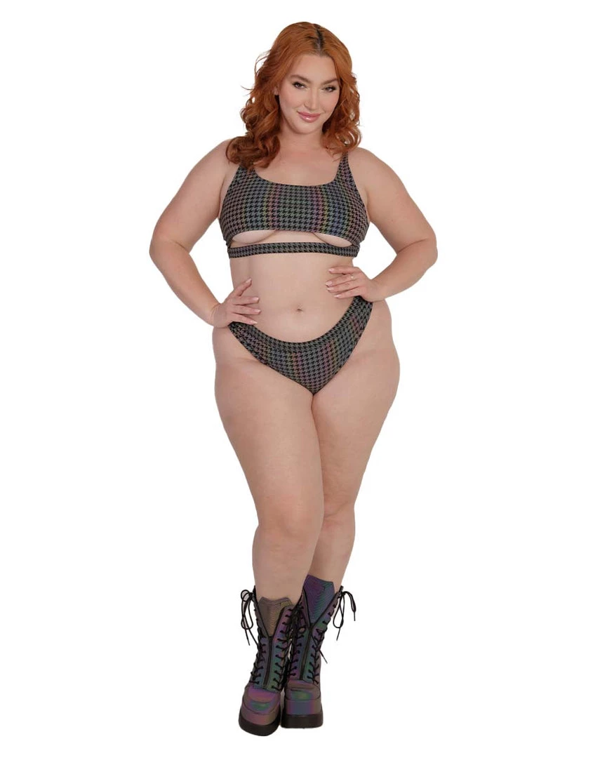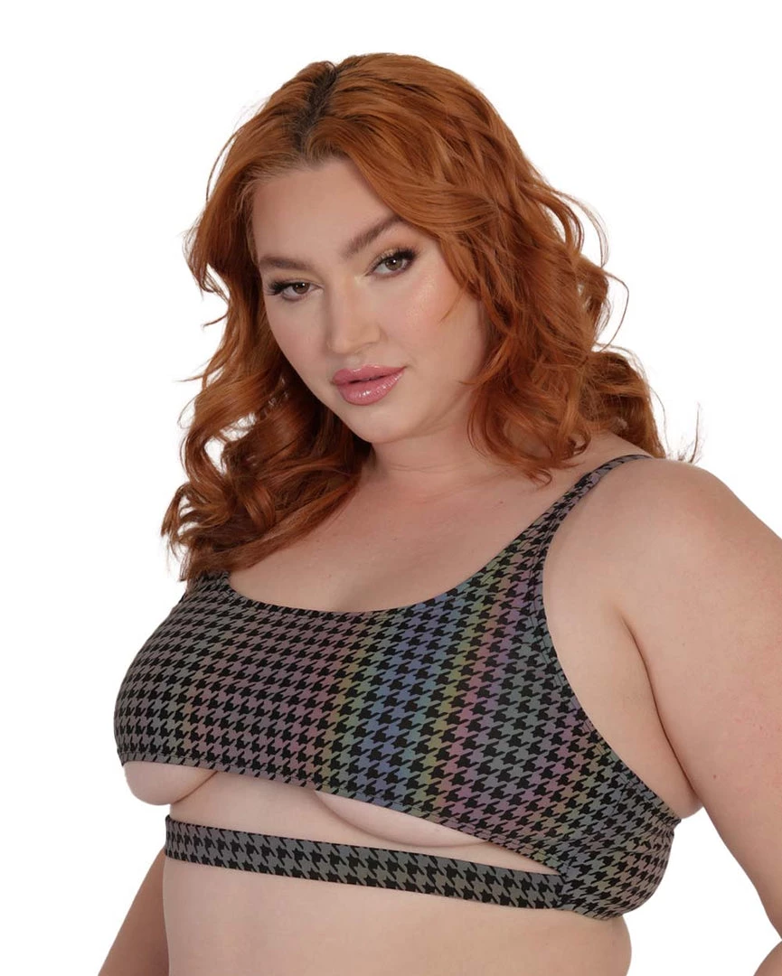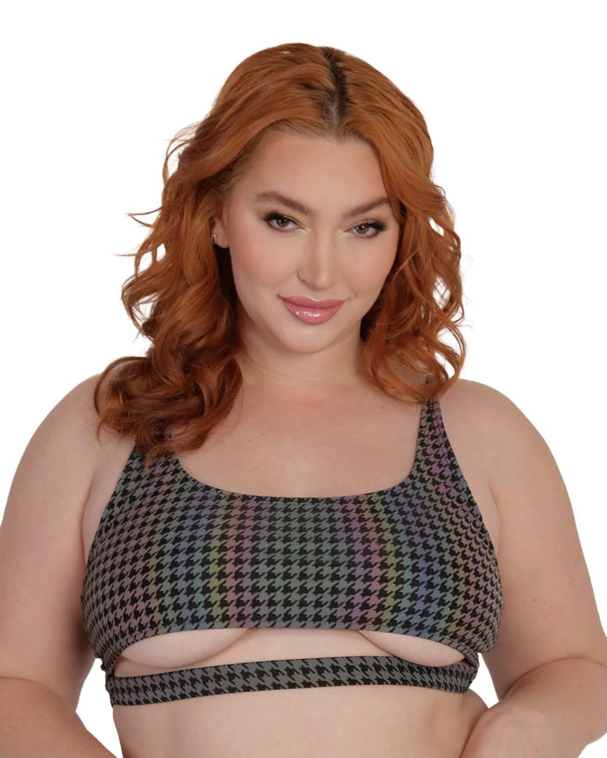 Take a walk down memory lane and complete ur next rave drip with the Groovy BB Reflective Underboob Top. This crop top features a scoop neckline, thin straps, an underboob cutout, and a wavy pattern that’s guaranteed to get u groovy.