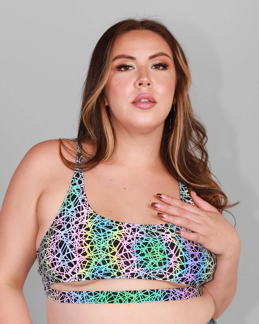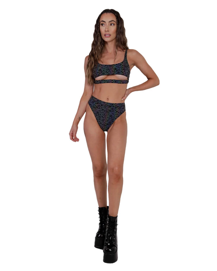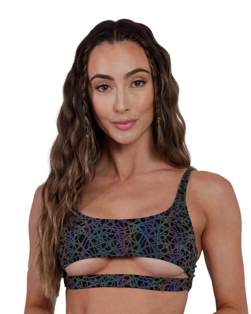 Bring some wavy vibes to ur rave fit with the Trippy Drip Reflective Underboob Top. This underboob cut-out top accentuates ur silhouette and makes u glow at night, thanks to its reflective material.