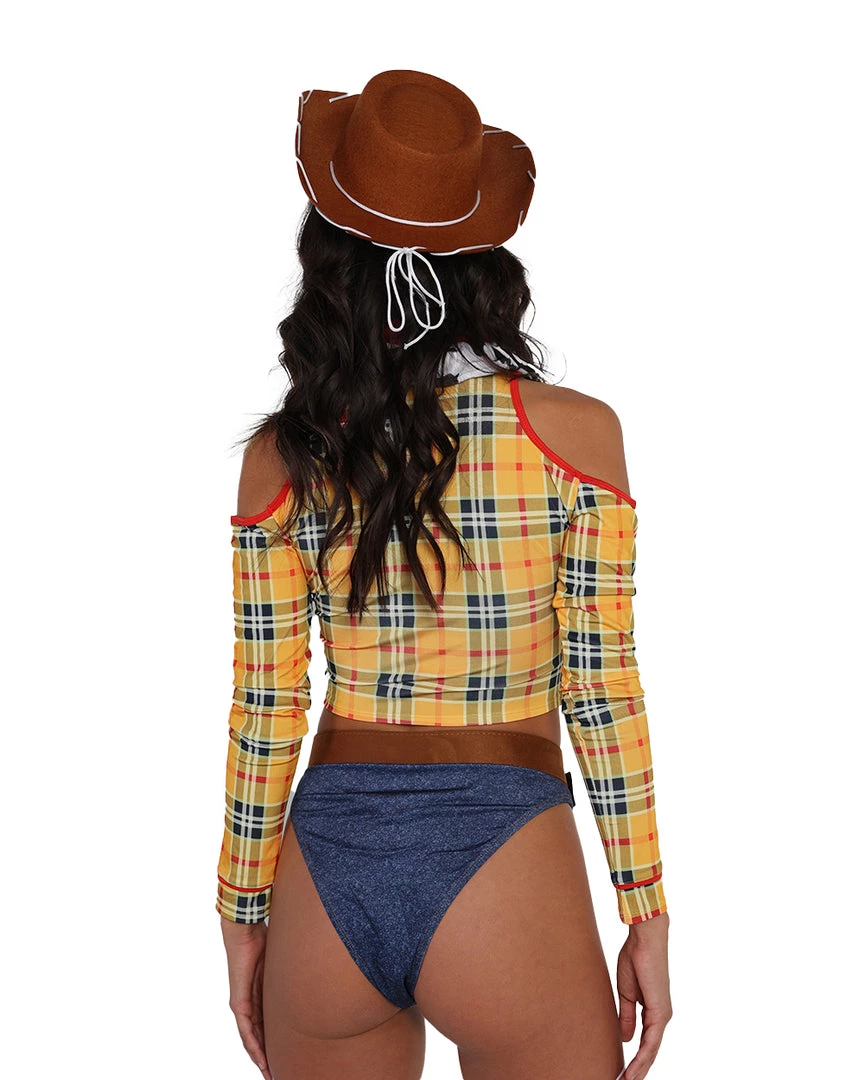 Make a killer entrance to ur upcoming party with the Woody Cowgirl Costume Set. This costume comes with a plaid long-sleeve crop top, bandana, and bottoms that feature a sexy leg harness.Â