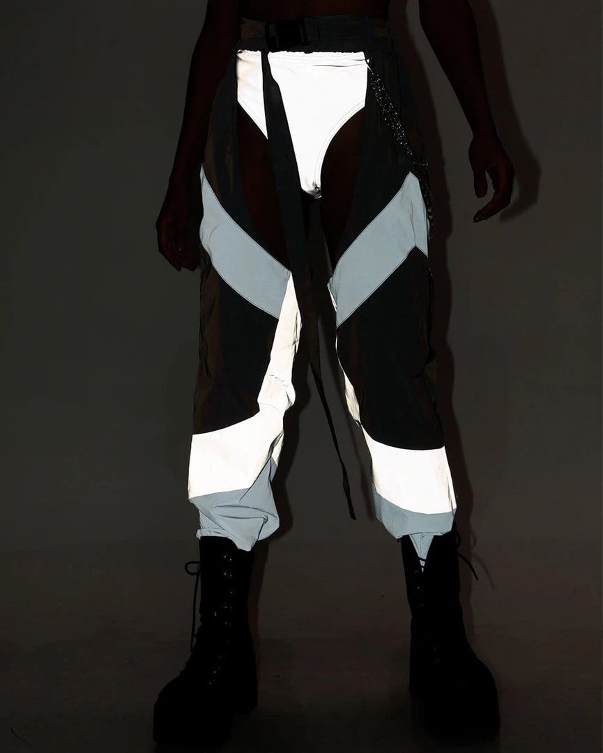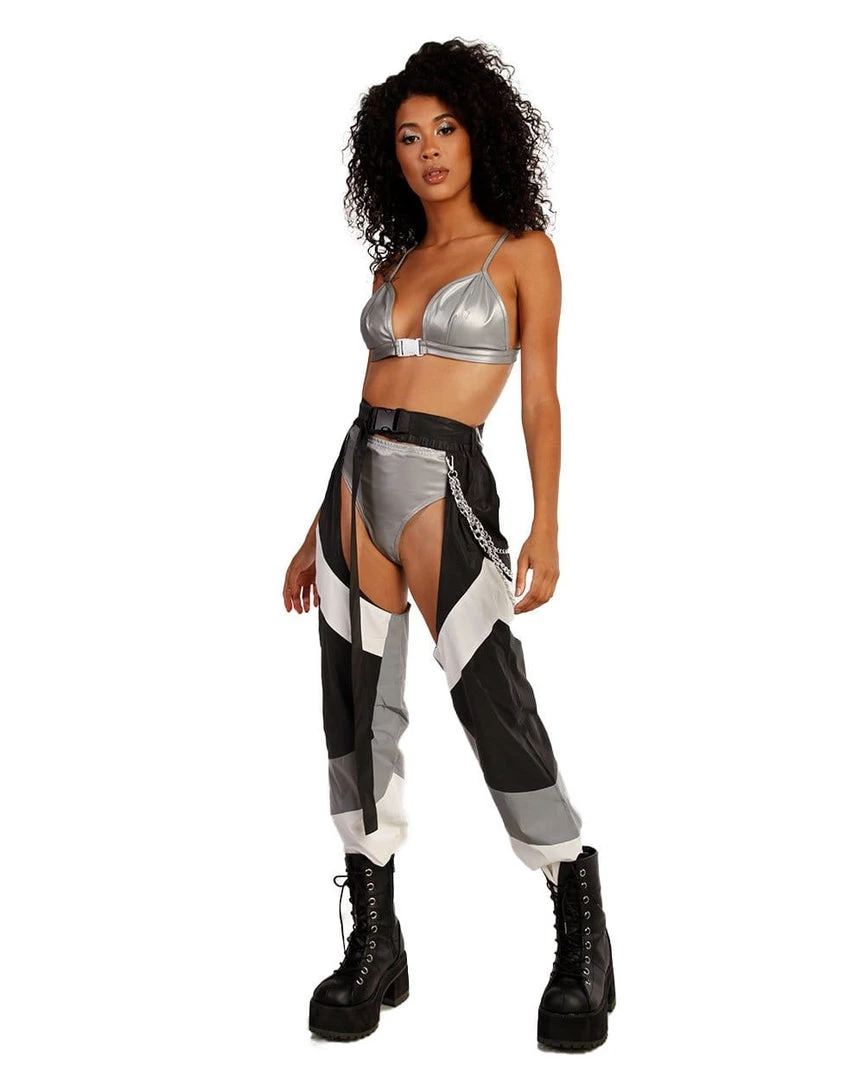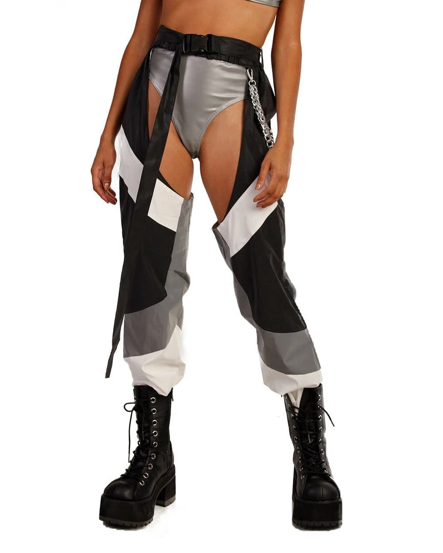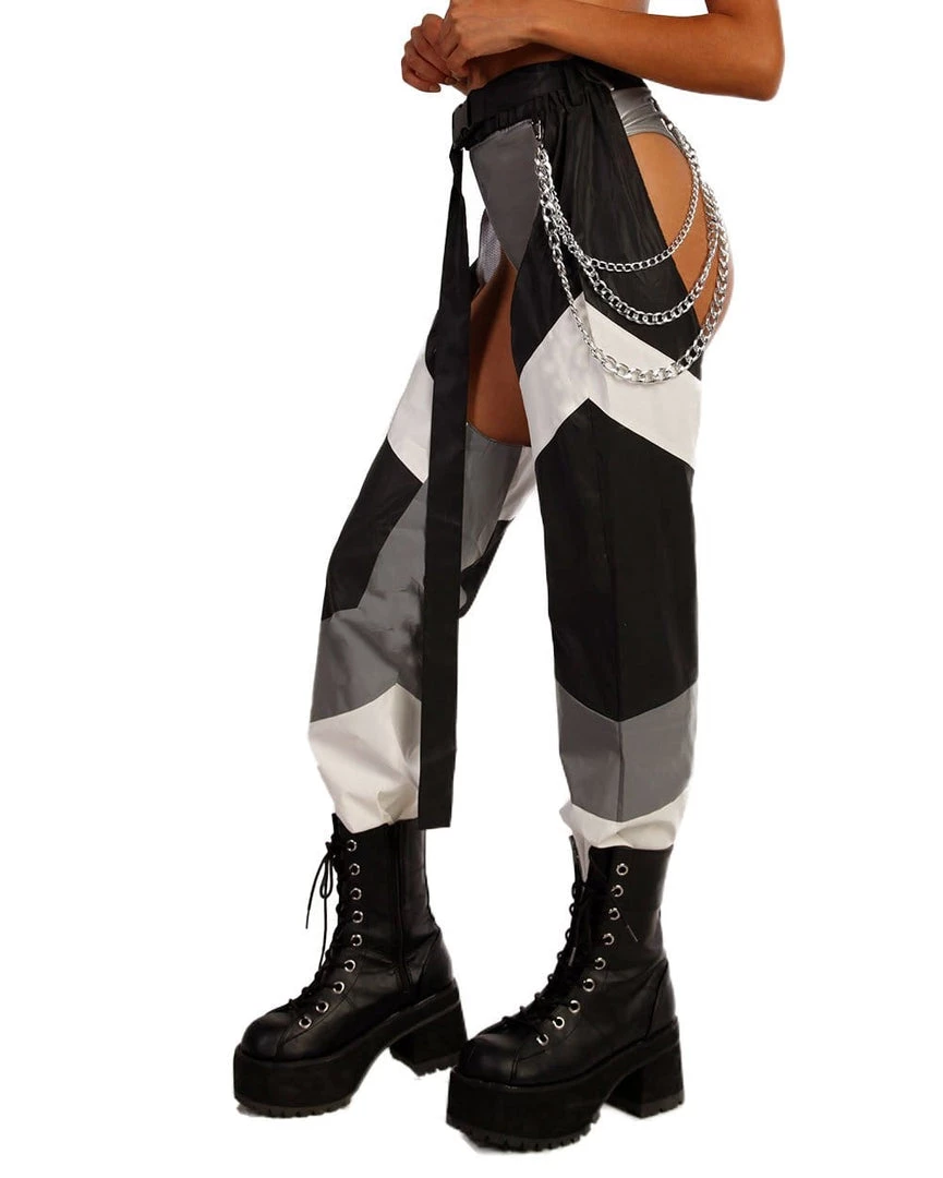 Be the hottie in charge in our Down 4 The Ride Reflective Chain Chaps. These dope AF grey, white and black chap pants have an epic reflective feature, adjustable center buckle closure with a edgy removable silver layered chain.