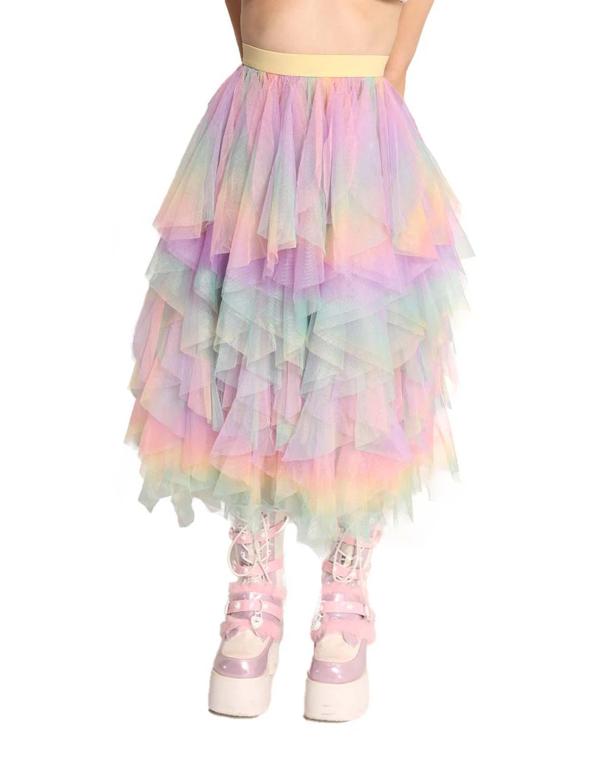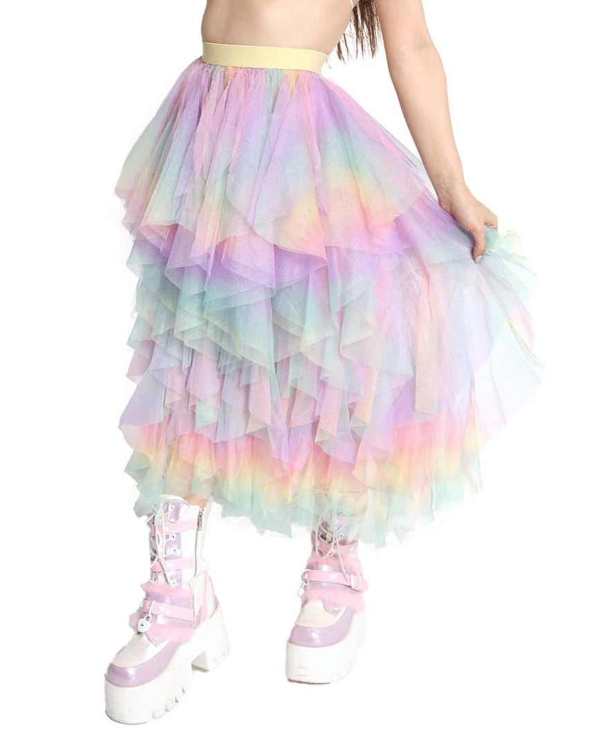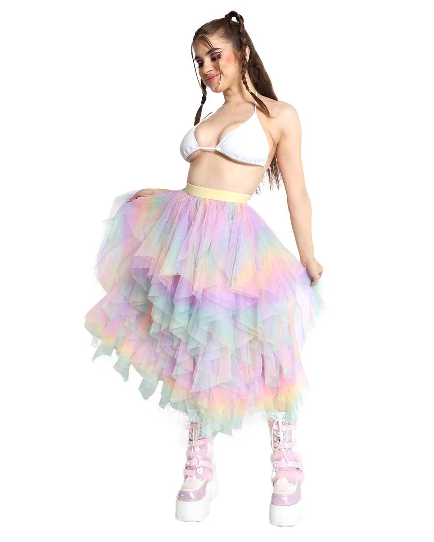 Our Euphoric Feelings Maxi Skirt is the embodiment of a dream come true. It has a stretchy waistband and layers and layers of tulle with purple, pink, yellow, and green details all over.