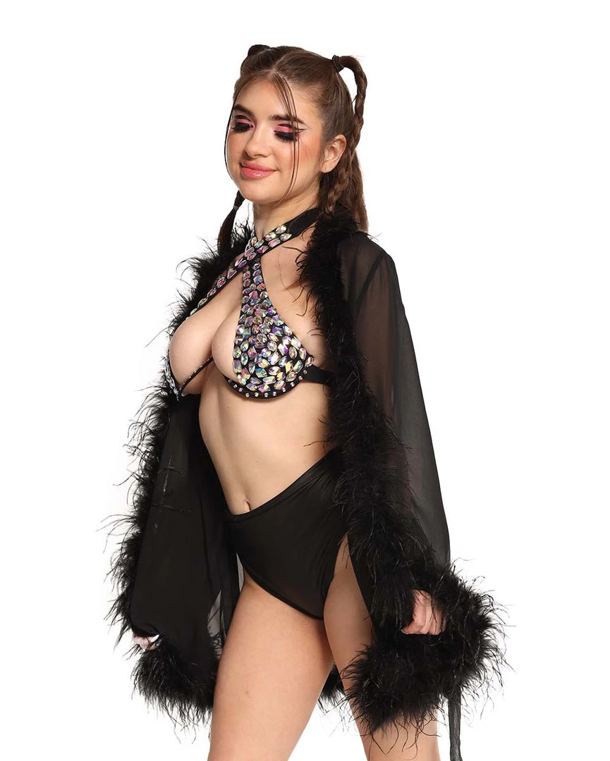 Our Heavenly Bliss Marabou Mesh Cover Up will bring ur inner angel baby forth. This all-white robe is made from a mesh material that sways gracefully to ur every movement. It’s decorated with fluffy marabou all over for that boujee but baddie effect.