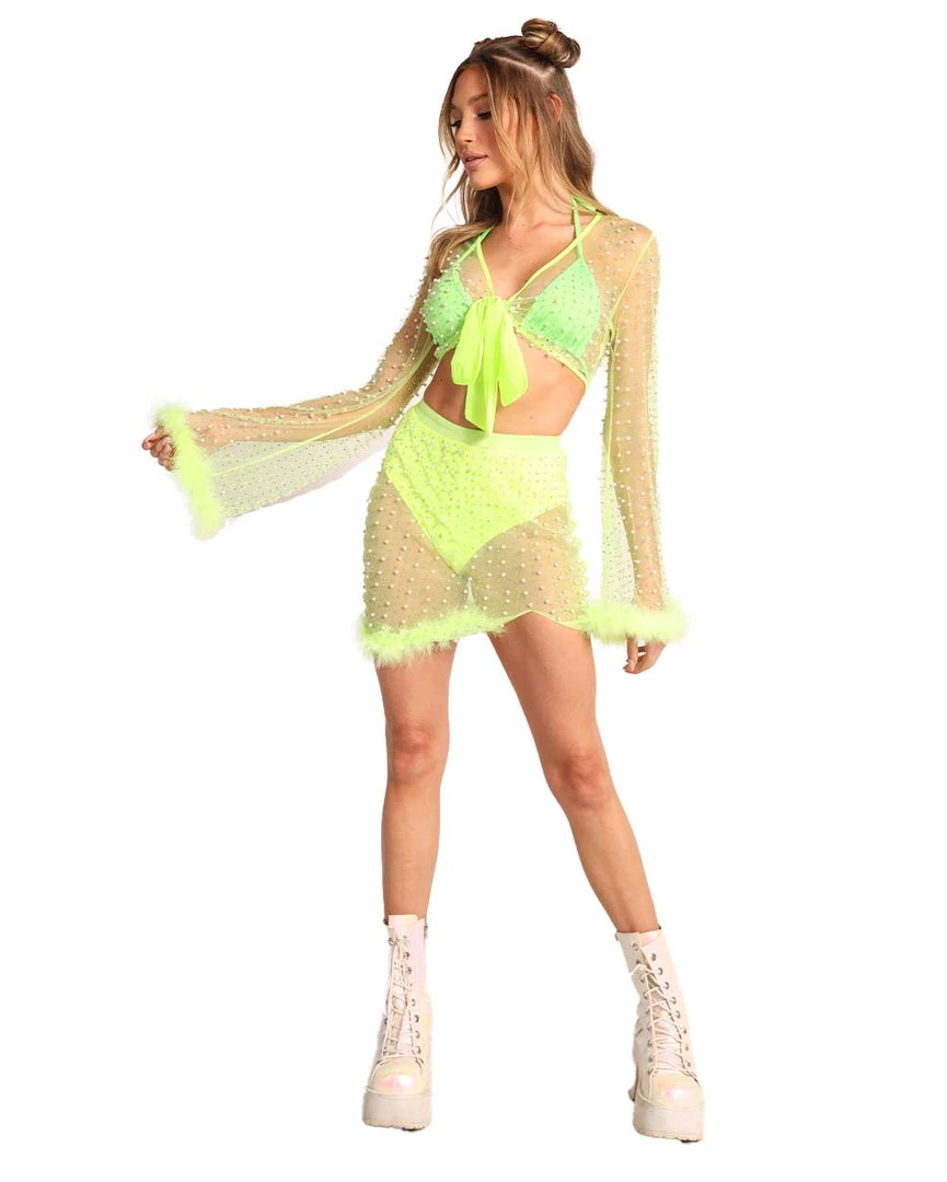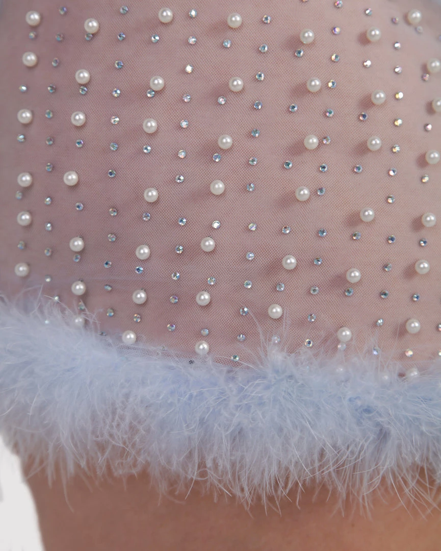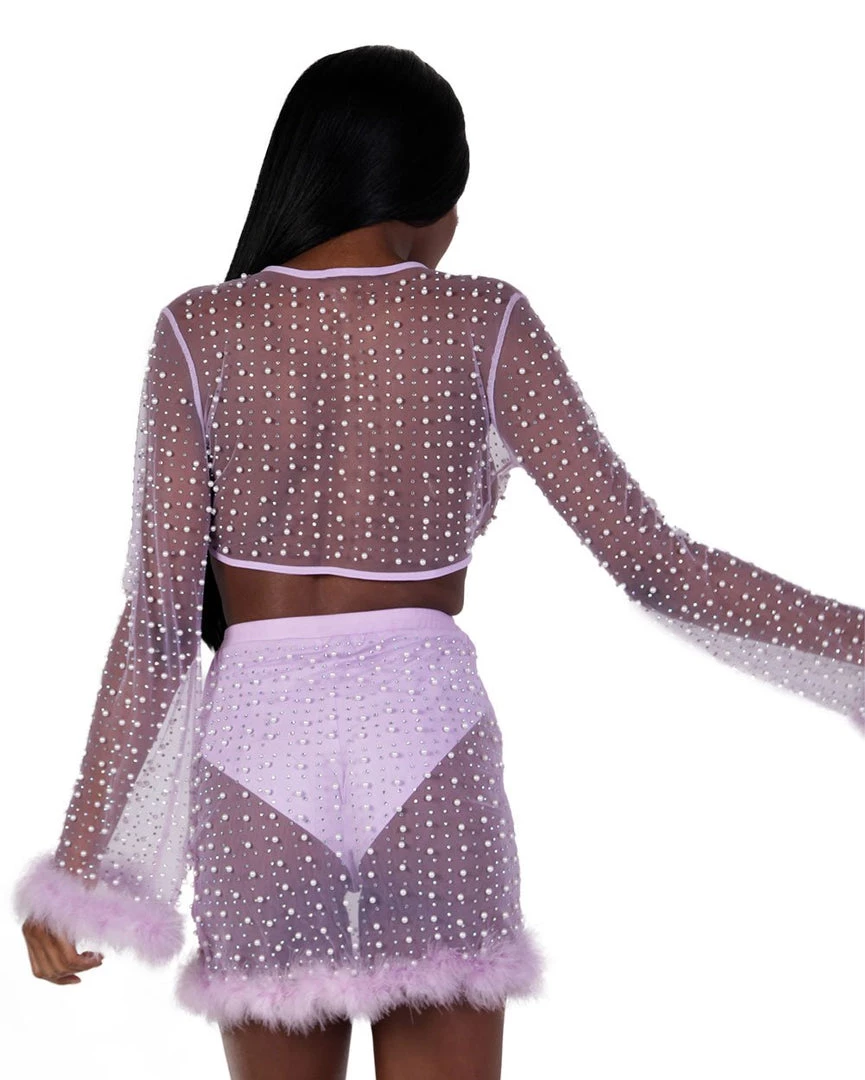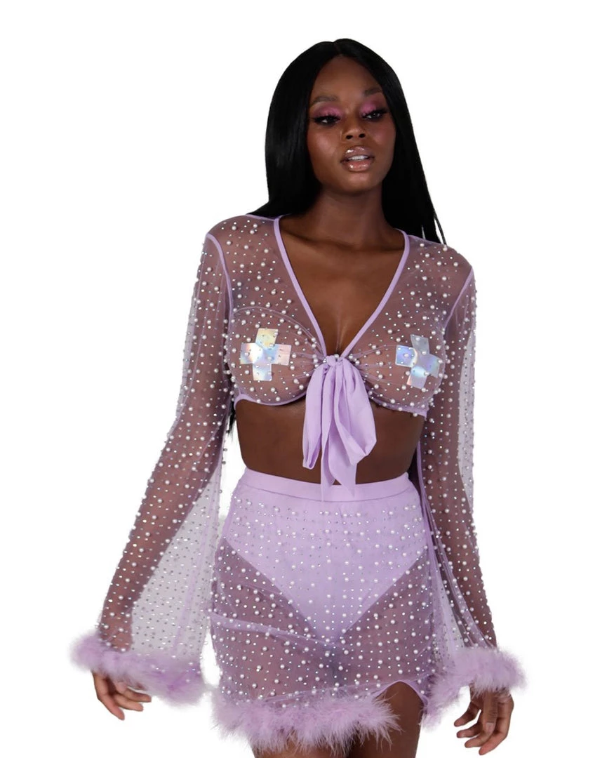 Make the first move on your crush in our Glamour Girl Pearl Studded Marabou Skirt Set. This super glam set includes a sheer bell sleeved crop top with a front tie closure embellished with stunning pearls and a matching high waisted mini skirt with a marabou feather trim.