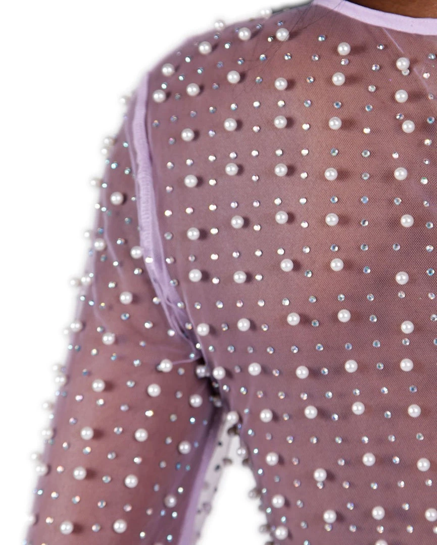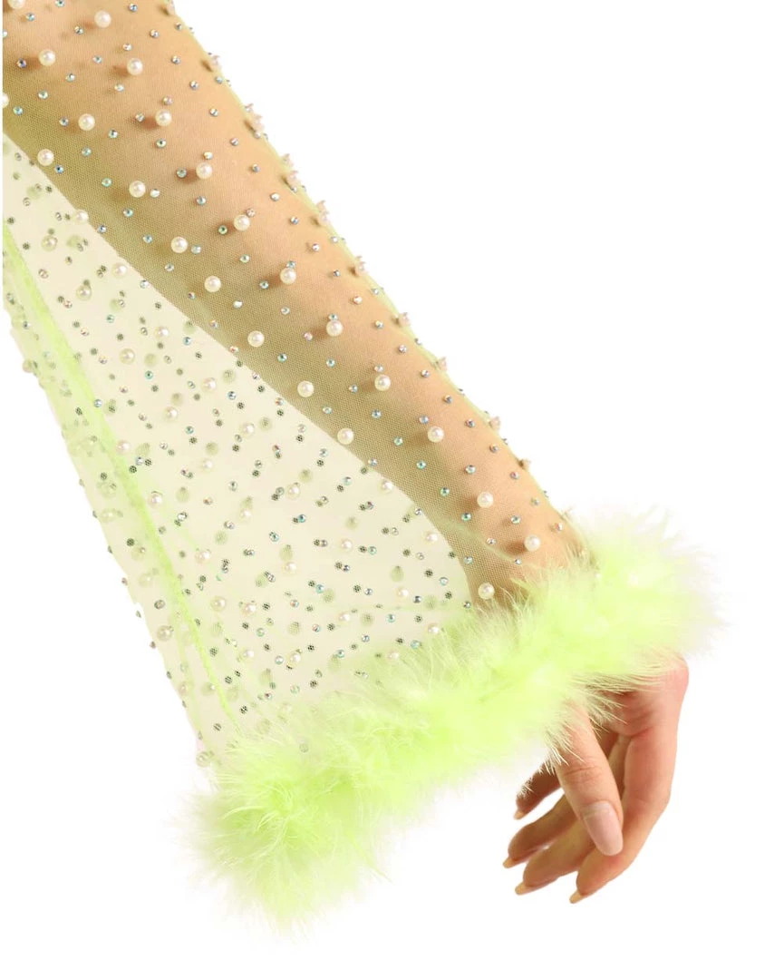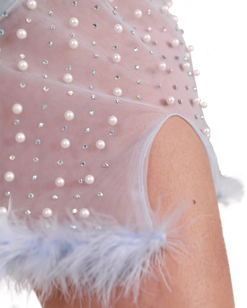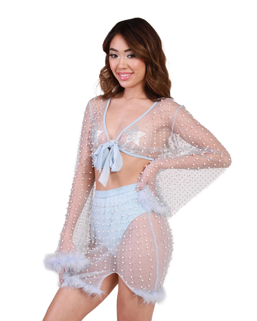 Make the first move on your crush in our Glamour Girl Pearl Studded Marabou Skirt Set. This super glam set includes a sheer bell sleeved crop top with a front tie closure embellished with stunning pearls and a matching high waisted mini skirt with a marabou feather trim.