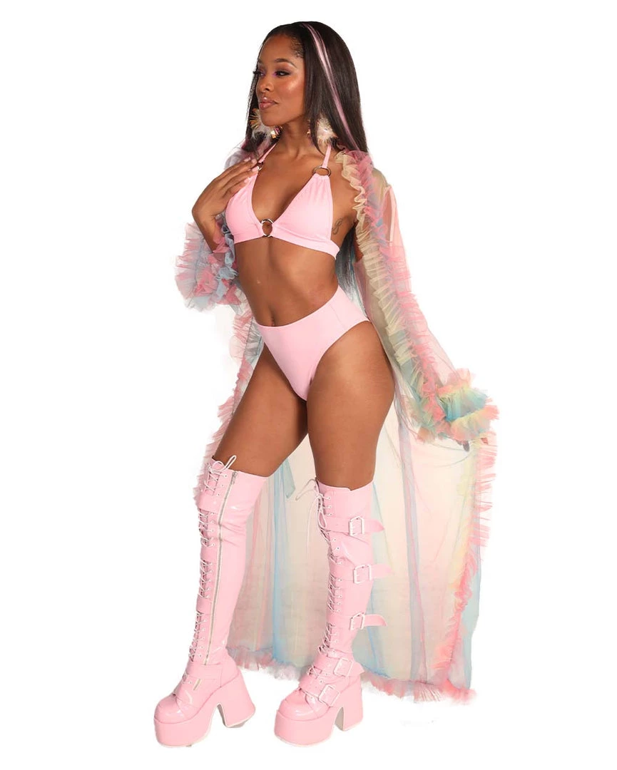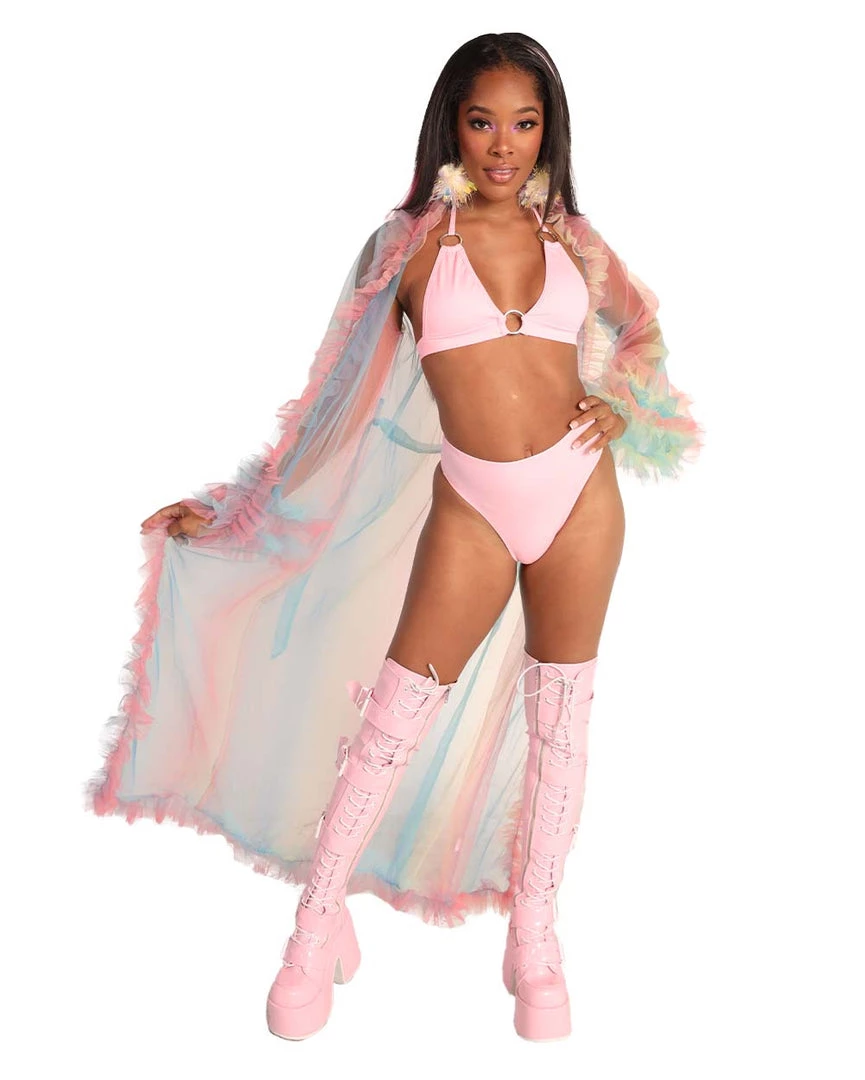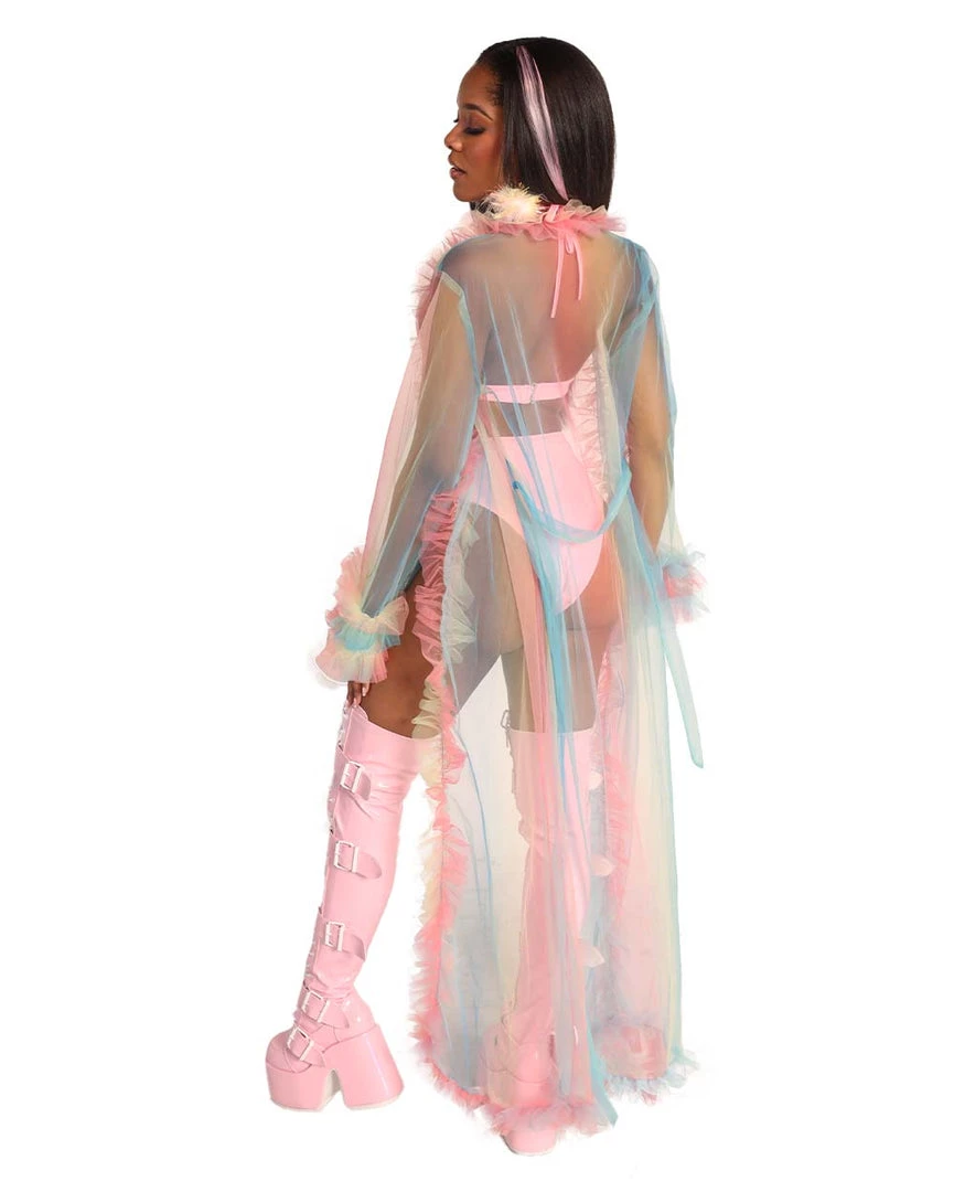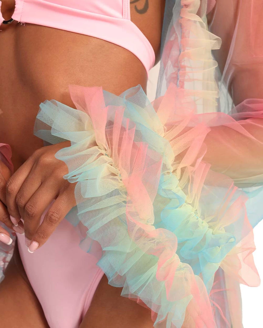 U are a rainbow angel in disguise wearing our Lover Mesh Ruffled Cover Up. This mesh robe features a stunning pink, blue, and yellow ombre print all over with ruffles on the hems.