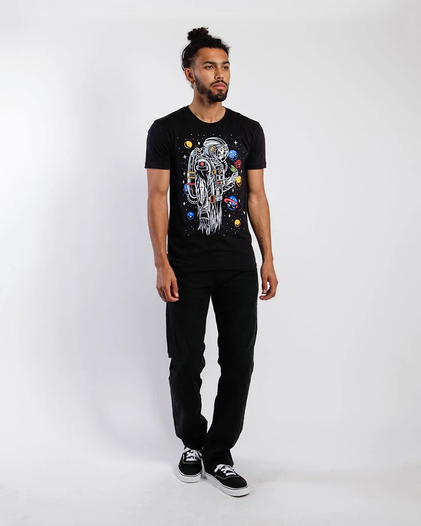 The interstellar circle of life spawns stardust and dark matter in the same sweet breath. But where our explorer finds a rose is the same spot he reaches the end on our original Galactic Cycle design on a black tee. This premium poly-cotton blend gives you the best of both worlds: a buttery soft blank that is breathable doesn’t shrink and lasts longer than 100% cotton tees.