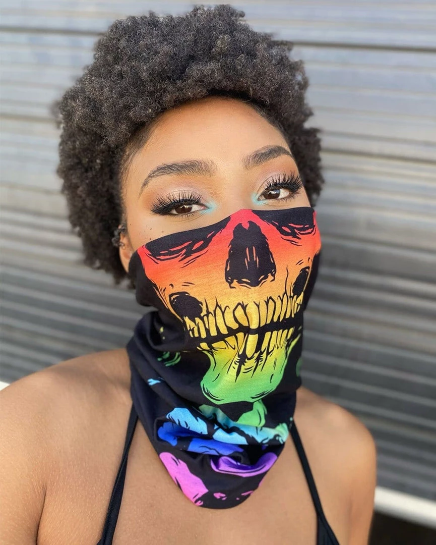 The Rainbow Skeleton Seamless Mask Bandana is a multi-functional face-covering that slides easily over your head to cover your neck, mouth, and nose. It can also be worn as a headband, wristband, hair tie, and more!