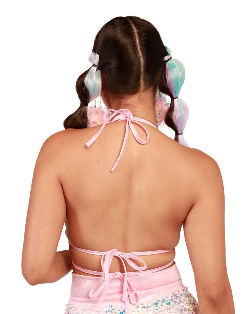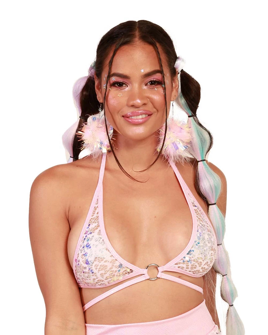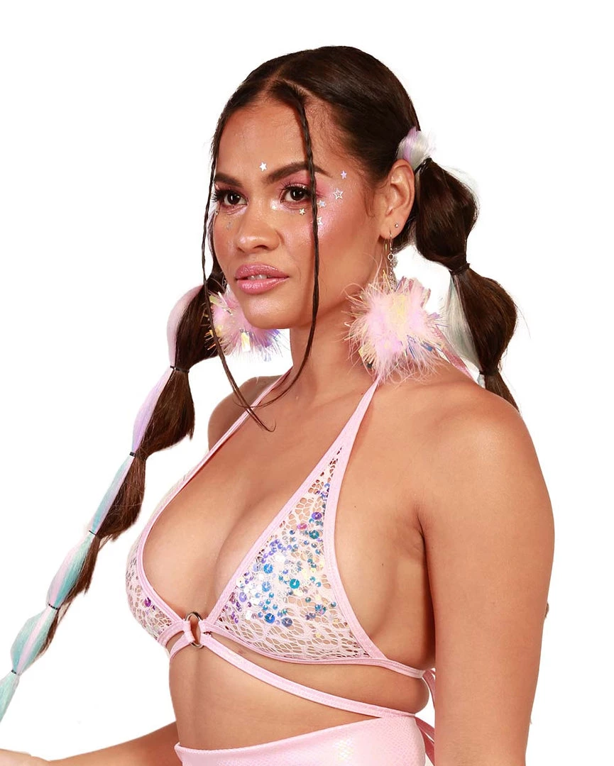 Our J. Valentine Slice of Heaven Sequin Wrap Top is a statement-maker beyond ur wildest dreams. This triangle top has a plunging neckline, silver o-ring hardware, and straps that wrap around the body. Wear it with its matching ultra crop top for an unforgettably fabulous look.