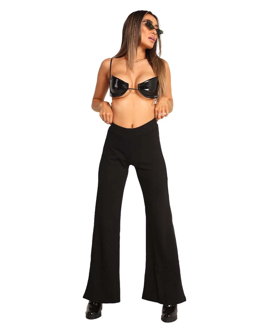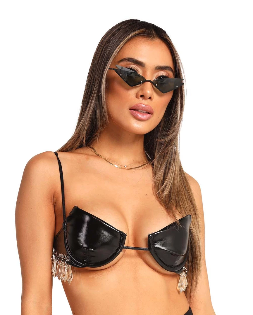 Get ready to look all kinds of glam with the Strike A Pose Vinyl Top. This vinyl bra top has a plunging neckline, spaghetti straps, and stunning crystal rhinestones on the sides.