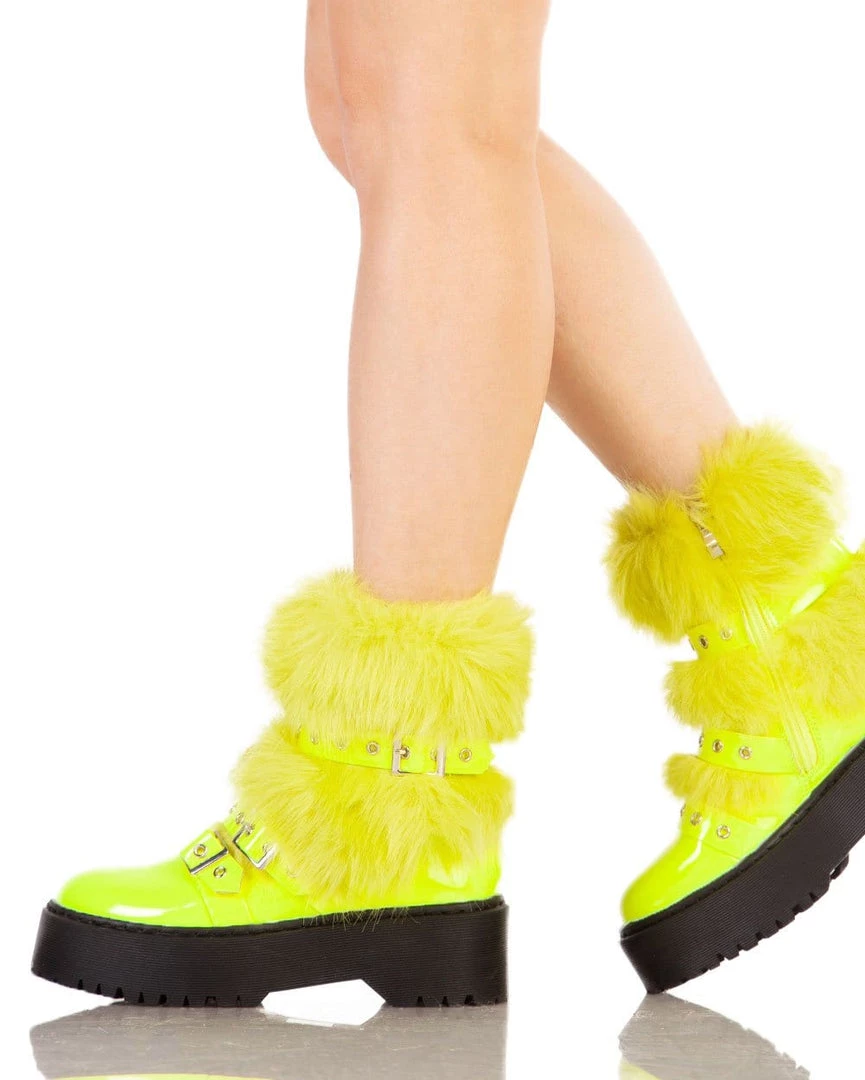 Make a wild statement and stomp into the night in our Issa Mood Furry Boots. These stylish ankle-length booties will have you feeling some type of way with their bold yellow color, the tough buckle details, and the fluffiest yellow fur as the cherry on top!