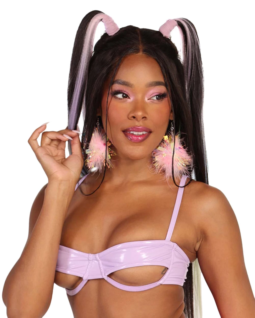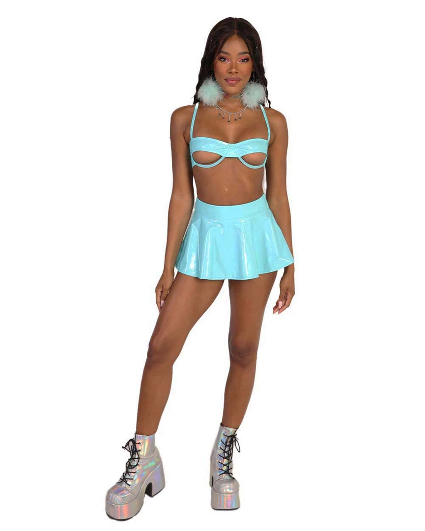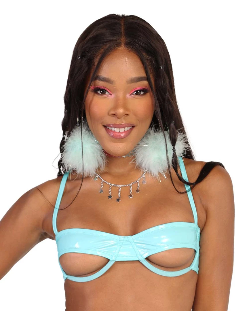 U are a sight to behold in our In Charge of LooksVinyl Underboob Top. This latex top with underboob detailing comes in neon pink and green, both illuminate beautifully when hit by light.