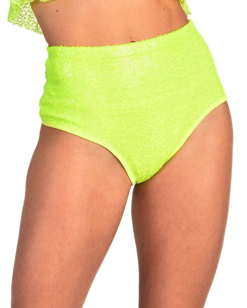 Shut it down in our Dreamland Sequin Booty Shorts. These ultra sparkly Neon Yellow rave bottoms are high waisted, high cut with a moderately cheeky back.