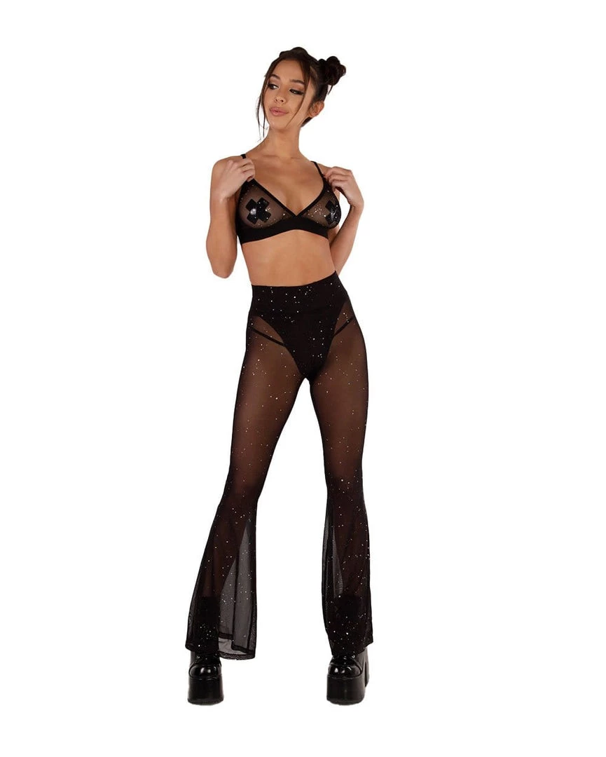 You’re ready to shut it down in our Holo Star Mesh Bell Bottoms. These party pants feature a black mesh star fabric, high waisted & flare fit.