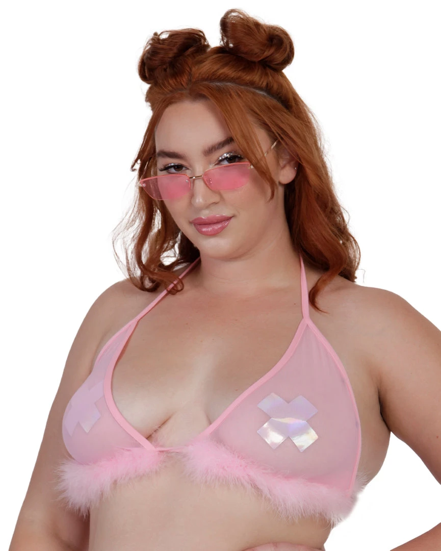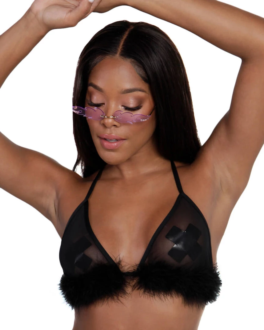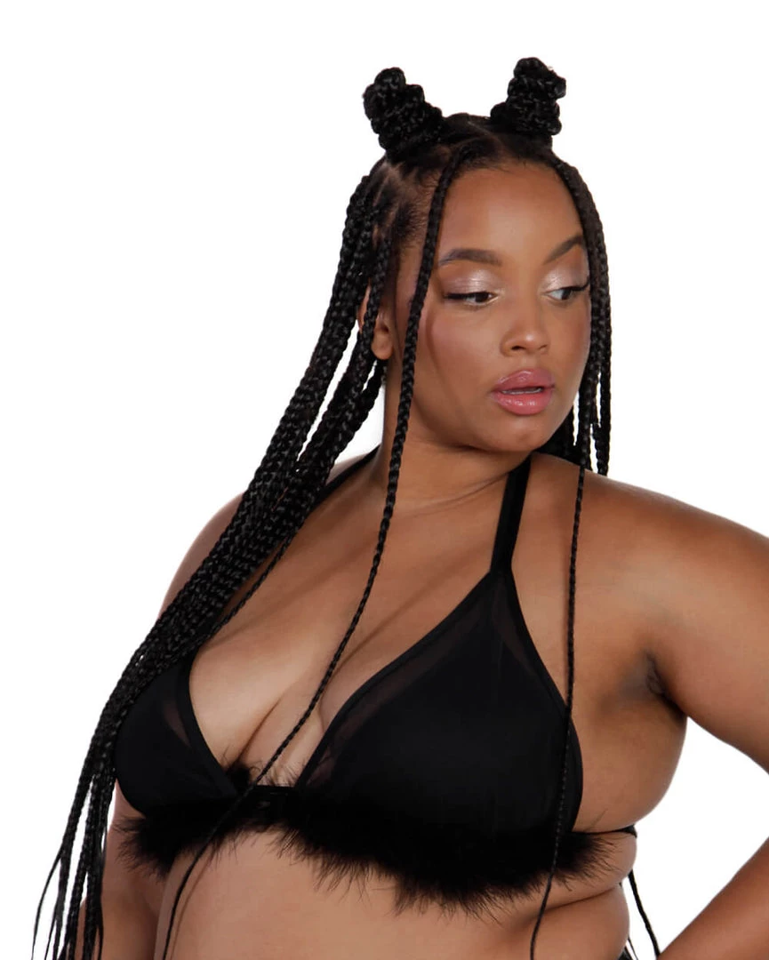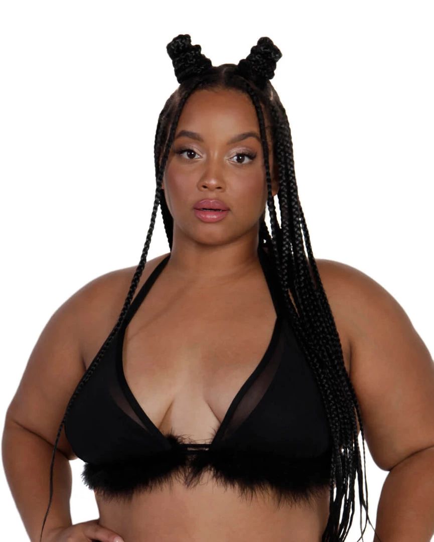 Look fabulously flirty in our Keepin’ It Cute & Fluffy Triangle Top. This black bralette features skinny straps, triangle cups, and faux fur detailing making it look adorable AF.