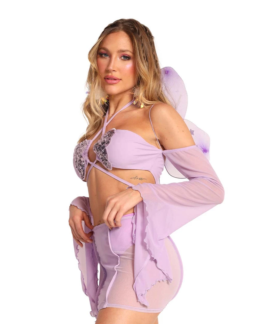 You’ll linger in their mind when they see u in our Airy Fairy Butterfly Halter Tie Top. This lavender top has a halter loop design, mesh bell sleeves, and a silver sequin accent on the cups.