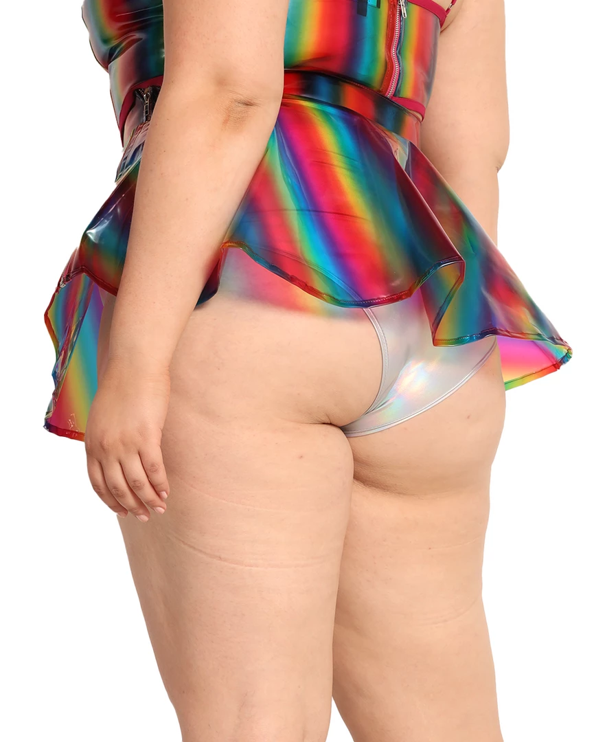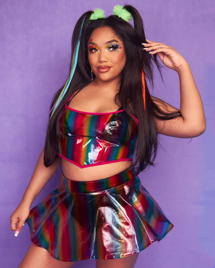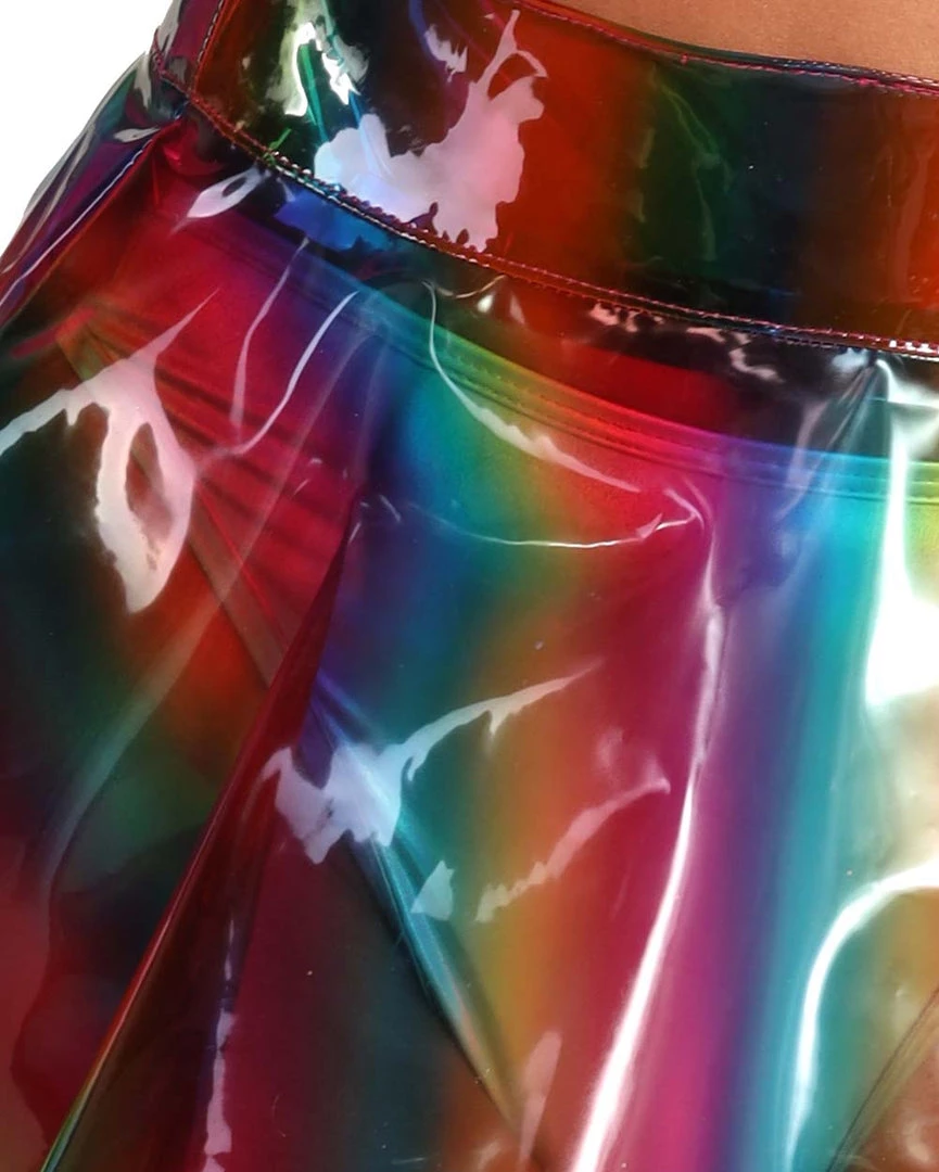 Our Over the Rainbow Vinyl Mini Skirt looks like a straight-up rainbow lollipop – our fave! It has a matte vinyl construction with a high-waist cut, a rainbow print that’s oh-so-dreamy, and a pleated design for optimum twirl.