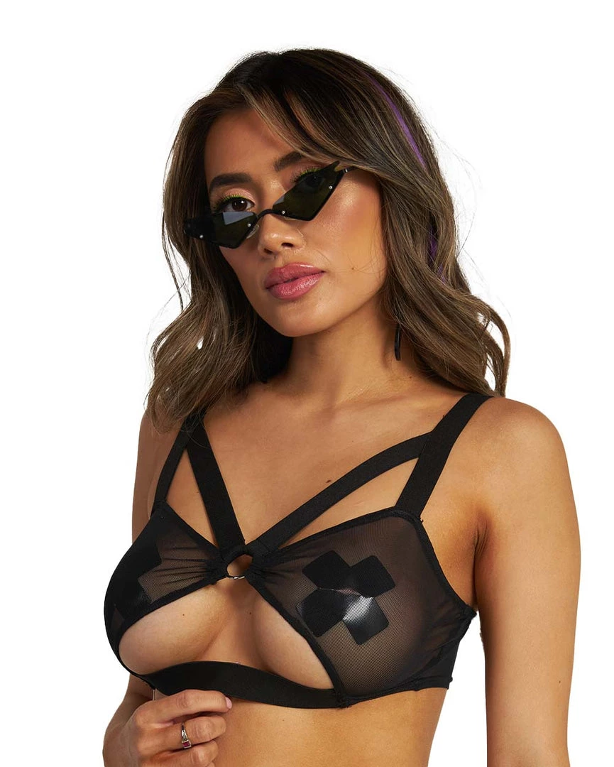 Get all tied up in our Rule the World Mesh O-Ring Crop Top. This sheer top features a keyhole cutout, an o-ring accent, and a strappy design.