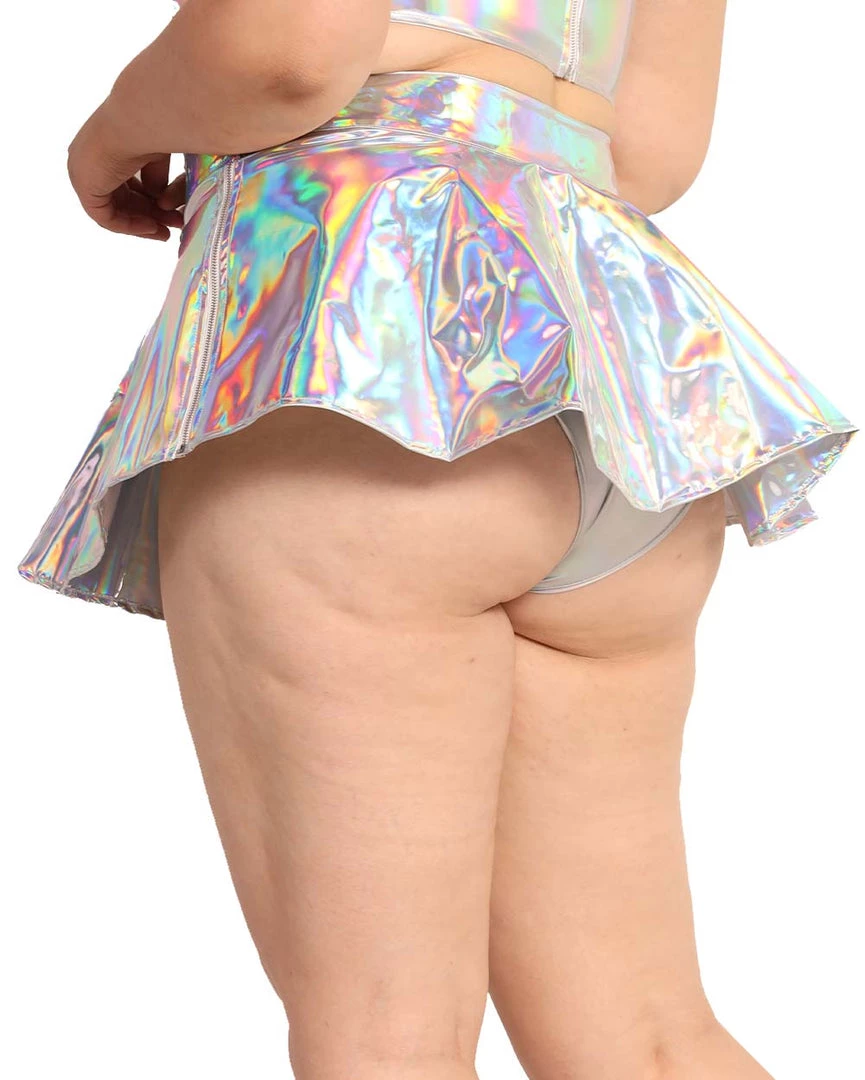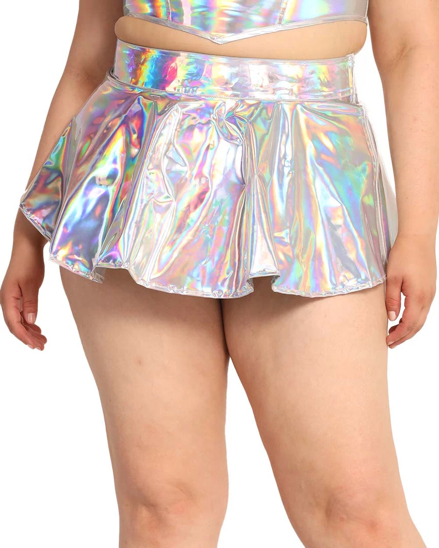 Trigger a nostalgic feeling with the Stargirl Holo Skater Skirt. It has a high-waisted cut, a flattering silhouette, and a holographic finish that draws the rainbow spectrum with the changing of the lights.