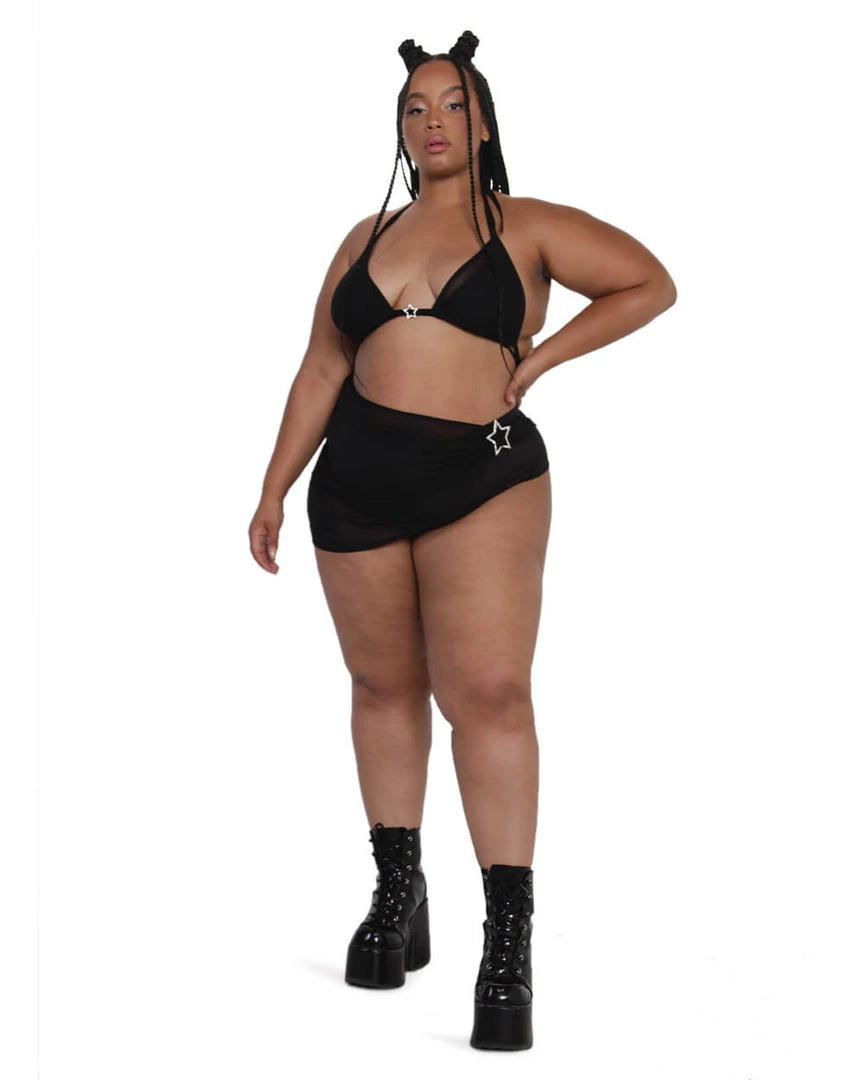 You’ll be the center of attraction with our Super Star Mesh Triangle Top. Designed with a see-through material and a sparkly star accent in the trim, this top looks fabulous with its matching asymmetrical skirt.