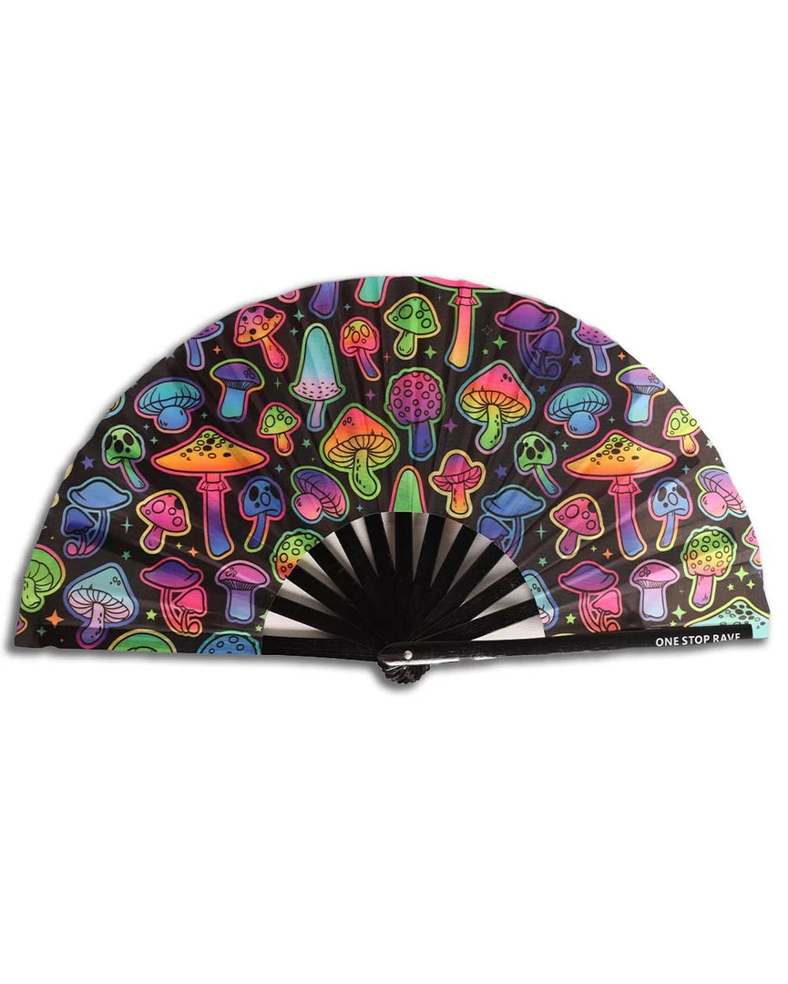 Time to get litty with our One Stop Rave UV Psilo Hand Fan. This rave fan features a beautiful neon mushroom print that’s sure to mesmerize anyone.