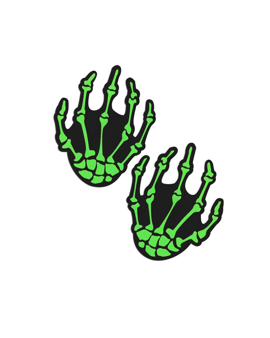 Scare away bad vibes with the Spooky Skeleton UV Reactive Pasties. These skeletal hand pasties come in neon green that glows in the dark, making them perfect to wear on their own or underneath a sheer top.