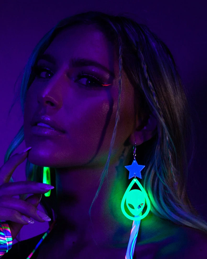 Beam me up! Look straight up outta this world in our Rolita Couture Alien Earrings. These yellow alien head earrings are super unique and feature blue stars on them.
