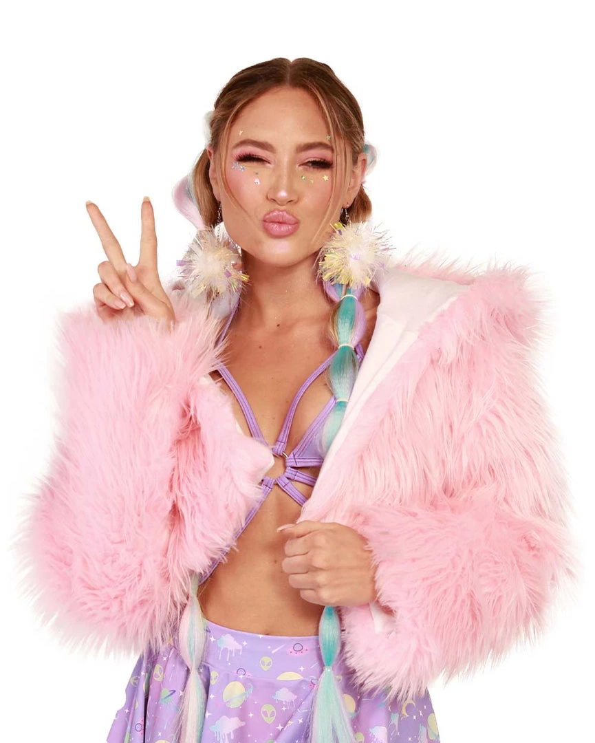 Our Lunita x iHR Fur Crop Jacket is giving vintage-but-make-it-rave vibes. Its cropped design coupled with its gorgeous pastel colors makes it the perfect finishing touch to ur next fit.