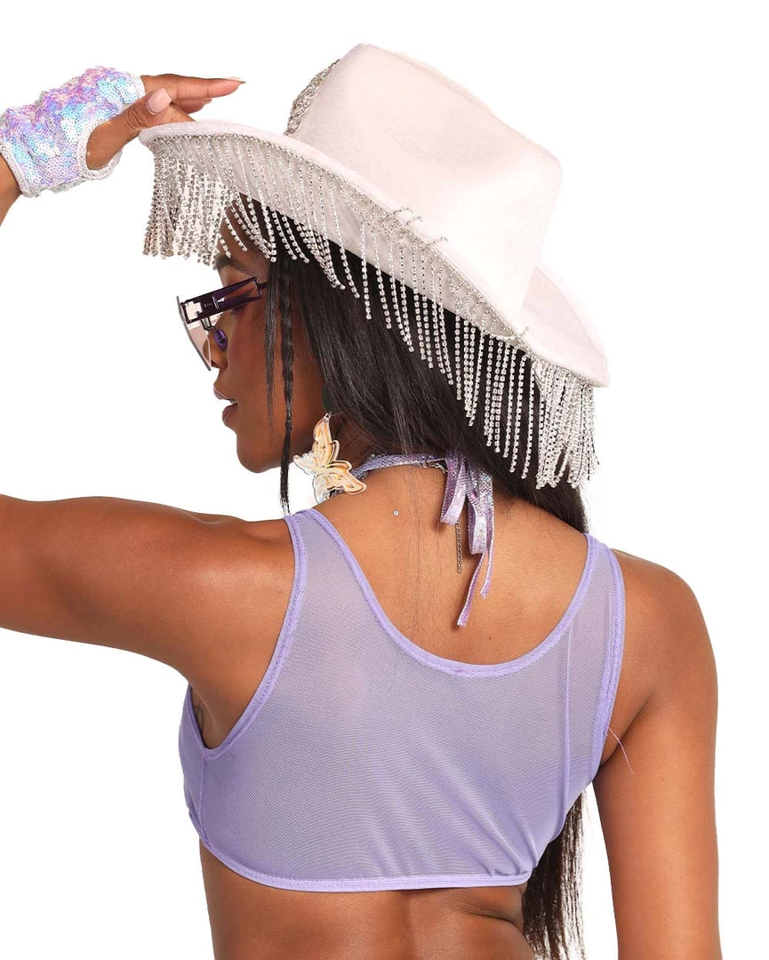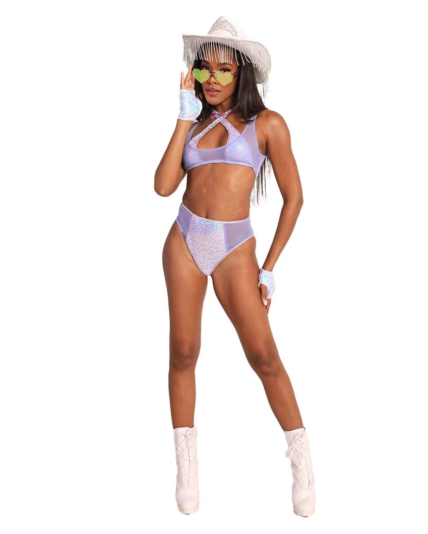 Go for two trends at once with our Roma Magic Dust Sequin Mesh Halter Top. This top combines mesh and sequin fabric and is accented with a halter loop neckline.