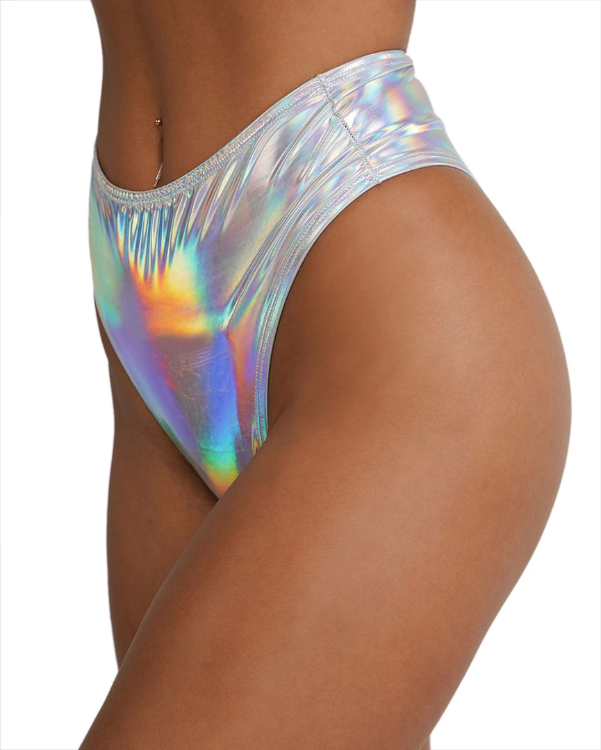 Bring ur electric spirit to life with the Holosexual Hi-Cut Bottoms. These cheeky bottoms feature a rainbow holographic fabric, high-waisted fit, and cheeky cut.