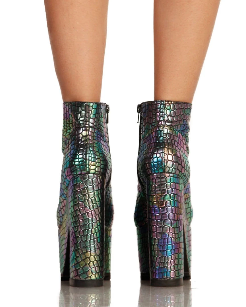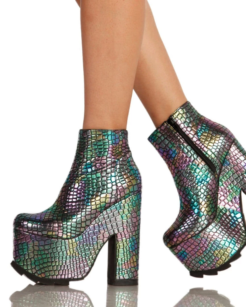 You’re ready to serve up looks in our YRU X IHR Exclusive Nightmare Booties. These sleek metallic rainbow platform boots are ankle length, with a side zipper closure and rubber treaded soles.