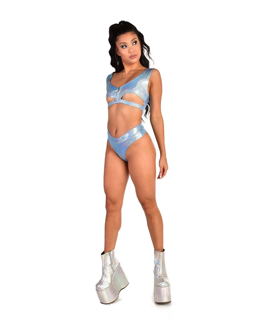 Slay the rave in our Dream Chasin’ Underboob Crop Top. This stunning and ultra sparkly blue top has a tasteful underboob detail with a center zipper closure.