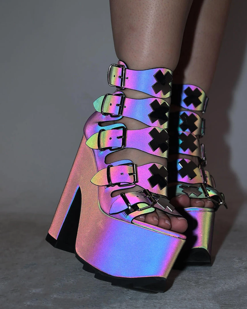 Get ready to headbang so hard in our YRU Dreamscape X YRU Rainbow Reflective Platform Heels. These reflective high-heel sandals with buckles galore produce a striking rainbow glow when hit by light.