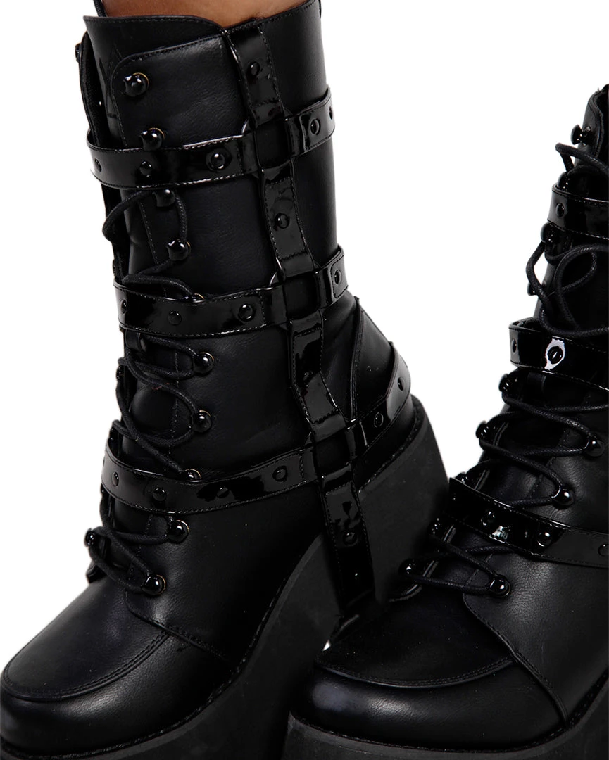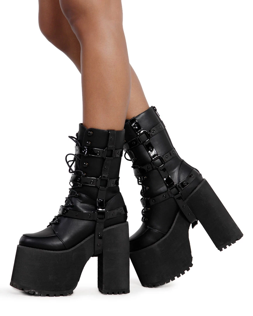 Lace-up, dress up and show off ur inner bad bish with the YRU Major Bondage Platform Heels. These ultra chunky platform boots feature bondage and buckle details to help u step up ur next rave fit.